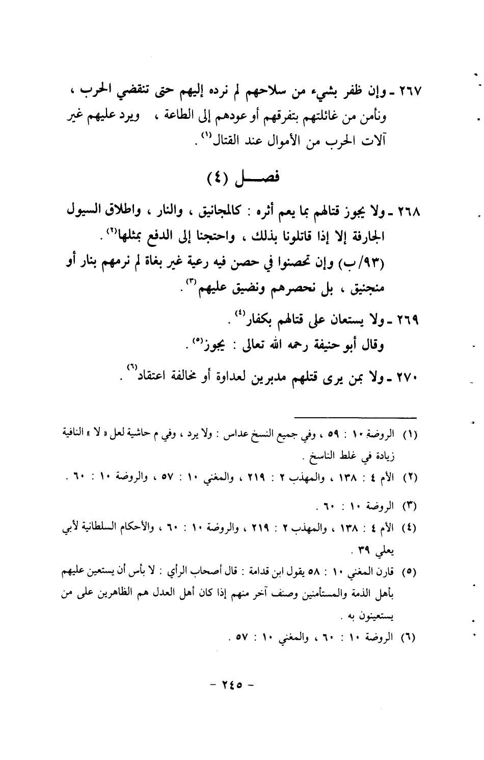 267 - وَإِن ظفر بِشَيْء من سِلَاحهمْ لم نرده إِلَيْهِم حَتَّى تَنْقَضِي الْحَرْب، ونأمن من غائلتهم بتفرقهم أَو عودهم إِلَى الطَّاعَة، وَيرد عَلَيْهِم غير آلَات الْحَرْب من الْأَمْوَال عِنْد الْقِتَال.