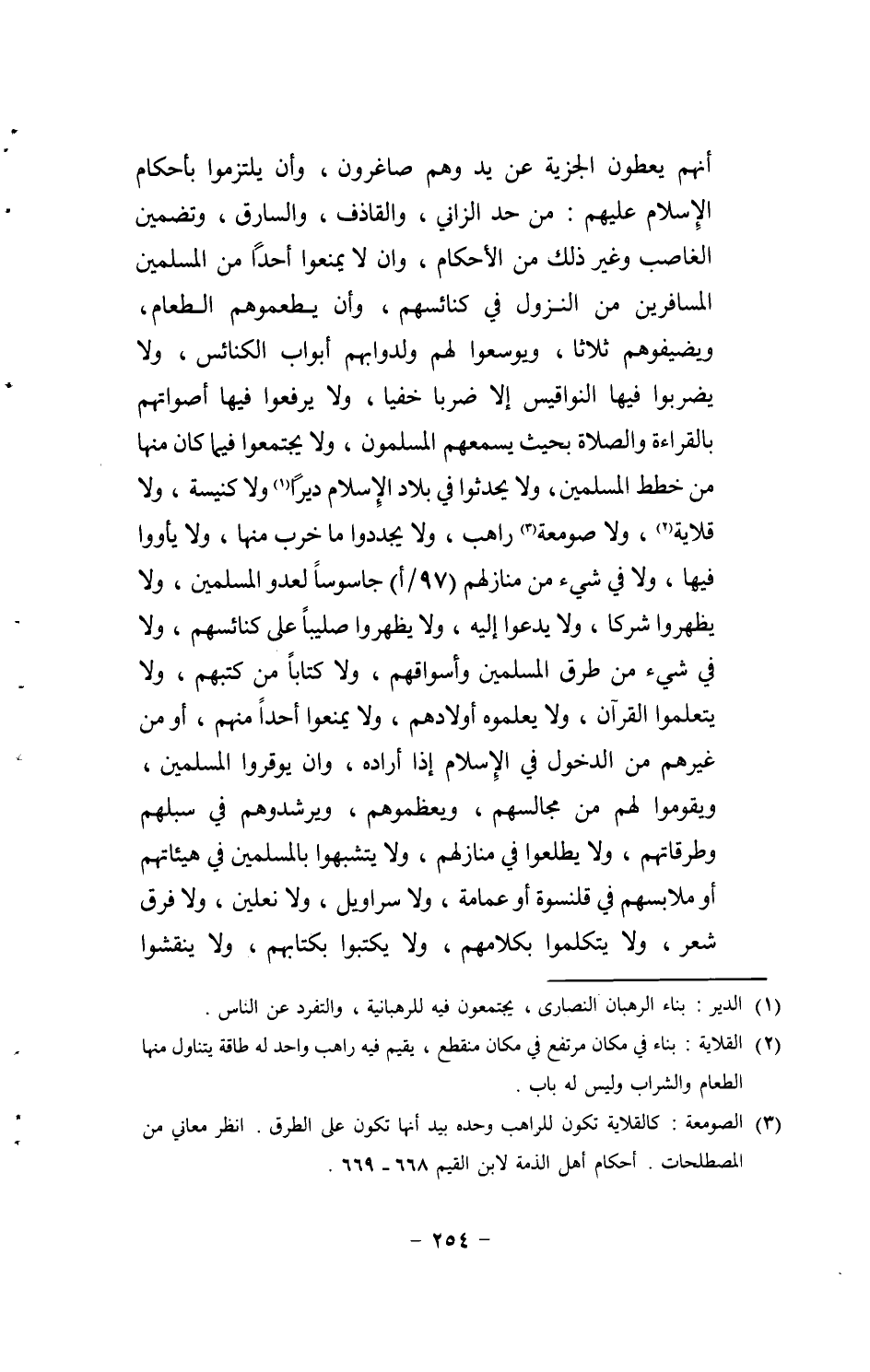 أَنهم يُعْطون الْجِزْيَة عَن يَد وهم صاغرون، وَأَن يلتزموا بِأَحْكَام الْإِسْلَام عَلَيْهِم: من حد الزَّانِي، والقاذف، وَالسَّارِق، وتضمين الْغَاصِب وَغير ذَلِك من الْأَحْكَام، وان لَا يمنعوا أحدا من الْمُسلمين الْمُسَافِرين من النُّزُول فِي كنائسهم، وَأَن يطعموهم الطَّعَام، ويضيفوهم ثَلَاثًا، ويوسعوا لَهُم ولدوابهم أَبْوَاب الْكَنَائِس، وَلَا يضْربُوا فِيهَا النواقيس إِلَّا ضربا خفِيا، وَلَا يرفعوا فِيهَا أَصْوَاتهم بِالْقِرَاءَةِ وَالصَّلَاة بِحَيْثُ يسمعهم الْمُسلمُونَ، وَلَا يجتمعوا فِيمَا كَانَ مِنْهَا من خطط الْمُسلمين، وَلَا يحدثوا فِي بِلَاد الْإِسْلَام ديراً، وَلَا كَنِيسَة، وَلَا قلاية، وَلَا صومعة رَاهِب، وَلَا يجددوا مَا خرب مِنْهَا، وَلَا يأووا فِيهَا، وَلَا فِي شَيْء من مَنَازِلهمْ (97 / أ) جاسوساً لعدو الْمُسلمين، وَلَا يظهروا شركا، وَلَا يدعوا إِلَيْهِ، وَلَا يظهروا صليباً على كنائسهم، وَلَا فِي شَيْء من طرق الْمُسلمين وأسواقهم، وَلَا كتابا من كتبهمْ، وَلَا يتعلموا الْقُرْآن، وَلَا يعلموه أَوْلَادهم، وَلَا يمنعوا أحدا مِنْهُم، أَو من غَيرهم، من الدُّخُول فِي الْإِسْلَام إِذا أَرَادَهُ، وان يوقروا الْمُسلمين، ويقوموا لَهُم من مجَالِسهمْ، ويعظموهم، ويرشدوهم فِي سبلهم وطرقاتهم، وَلَا يطلعوا فِي مَنَازِلهمْ، وَلَا يتشبهوا بِالْمُسْلِمين فِي هيئاتهم أَو ملابسهم فِي قلنسوة أَو عِمَامَة، وَلَا سَرَاوِيل، وَلَا نَعْلَيْنِ، وَلَا فرق شعر، وَلَا يتكلموا بكلامهم، وَلَا يكتبوا بِكِتَابِهِمْ، وَلَا ينقشوا