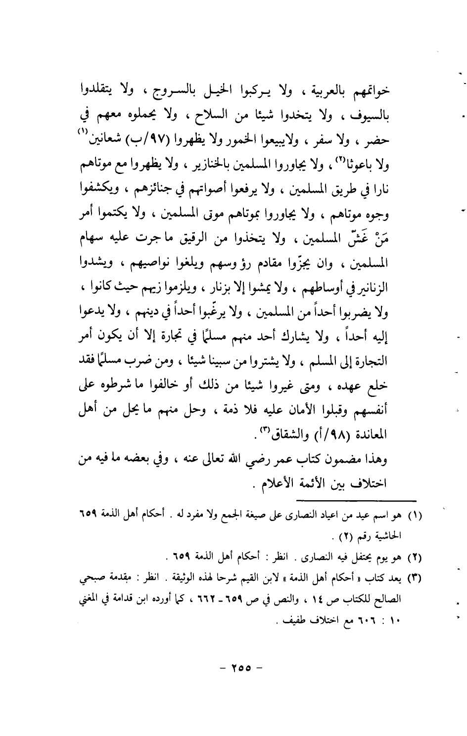 خواتمهم بِالْعَرَبِيَّةِ، وَلَا يركبُوا الْخَيل بالسروج، وَلَا يتقلدوا بِالسُّيُوفِ، وَلَا يتخدوا شَيْئا من السِّلَاح، وَلَا يحملوه مَعَهم فِي حضر، وَلَا سفر، وَلَا يبيعوا الْخُمُور وَلَا يظهروا (97 / ب) شعانين وَلَا باعوثا، وَلَا يجاوروا الْمُسلمين بالخنازير، وَلَا يظهروا مَعَ موتاهم نَارا فِي طَرِيق الْمُسلمين، وَلَا يرفعوا أَصْوَاتهم فِي جنائزهم، ويكشفوا وُجُوه موتاهم، وَلَا يجاوروا بموتاهم موتى الْمُسلمين، وَلَا يكتموا أَمر من غش الْمُسلمين، وَلَا يتخذوا من الرَّقِيق مَا جرت عَلَيْهِ سِهَام الْمُسلمين، وان يجزّوا مقادم رؤوسهم ويلغوا نواصيهم، ويشدوا الزنانير فِي أوساطهم، وَلَا يمشوا إِلَّا بزنار، ويلزموا زيهم حَيْثُ كَانُوا، وَلَا يضْربُوا أحدا من الْمُسلمين، وَلَا يرغّبوا أحدا فِي دينهم، وَلَا يدعوا إِلَيْهِ أحدا، وَلَا يُشَارك أحد مِنْهُم مُسلما فِي تِجَارَة إِلَّا أَن يكون أَمر التِّجَارَة إِلَى الْمُسلم، وَلَا يشتروا من سبينَا شَيْئا، وَمن ضرب مُسلما فقد خلع عَهده، وَمَتى غيروا شَيْئا من ذَلِك أَو خالفوا مَا شرطوه على أنفسهم وقبلوا الْأمان عَلَيْهِ فَلَا ذمَّة، وَحل مِنْهُم مَا يحل من أهل المعاندة (98 / أ) والشقاق. وَهَذَا مَضْمُون كتاب عمر رَضِي الله تَعَالَى عَنهُ، وَفِي بعضه مَا فِيهِ من اخْتِلَاف بَين الْأَئِمَّة الْأَعْلَام.