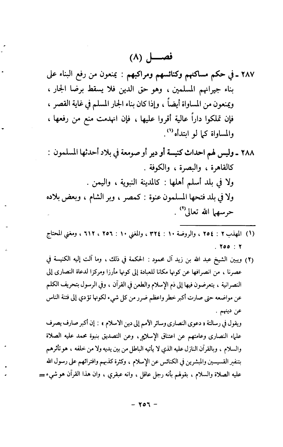 288 - وَلَيْسَ لَهُم أَحْدَاث كَنِيسَة أَو دير أَو صومعة فِي بِلَاد أحدثها الْمُسلمُونَ: كالقاهرة، وَالْبَصْرَة، والكوفة. وَلَا فِي بلد أسلم أَهلهَا: كالمدينة النَّبَوِيَّة، واليمن. وَلَا فِي بلد فتحهَا الْمُسلمُونَ عنْوَة: كمصر، وبر الشَّام، وَبَعض بِلَاده حرسهما الله تَعَالَى.