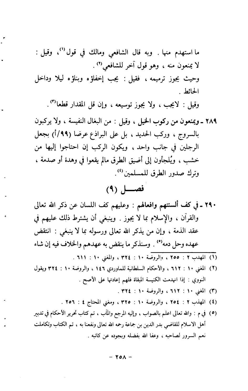 290 - فِي كف ألسنتهم وافعالهم: وَعَلَيْهِم كف اللِّسَان عَن ذكر الله تَعَالَى وَالْقُرْآن، وَالْإِسْلَام بِمَا لَا يجوز. وَيَنْبَغِي أَن يشْتَرط ذَلِك عَلَيْهِم فِي عقد الذِّمَّة، وَإِن من يذكر الله تَعَالَى وَرَسُوله بِمَا لَا يَنْبَغِي: انْتقض عَهده وَحل دَمه. وَسَنذكر مَا ينْقض بِهِ عَهدهم وَالْخلاف فِيهِ إِن شَاءَ