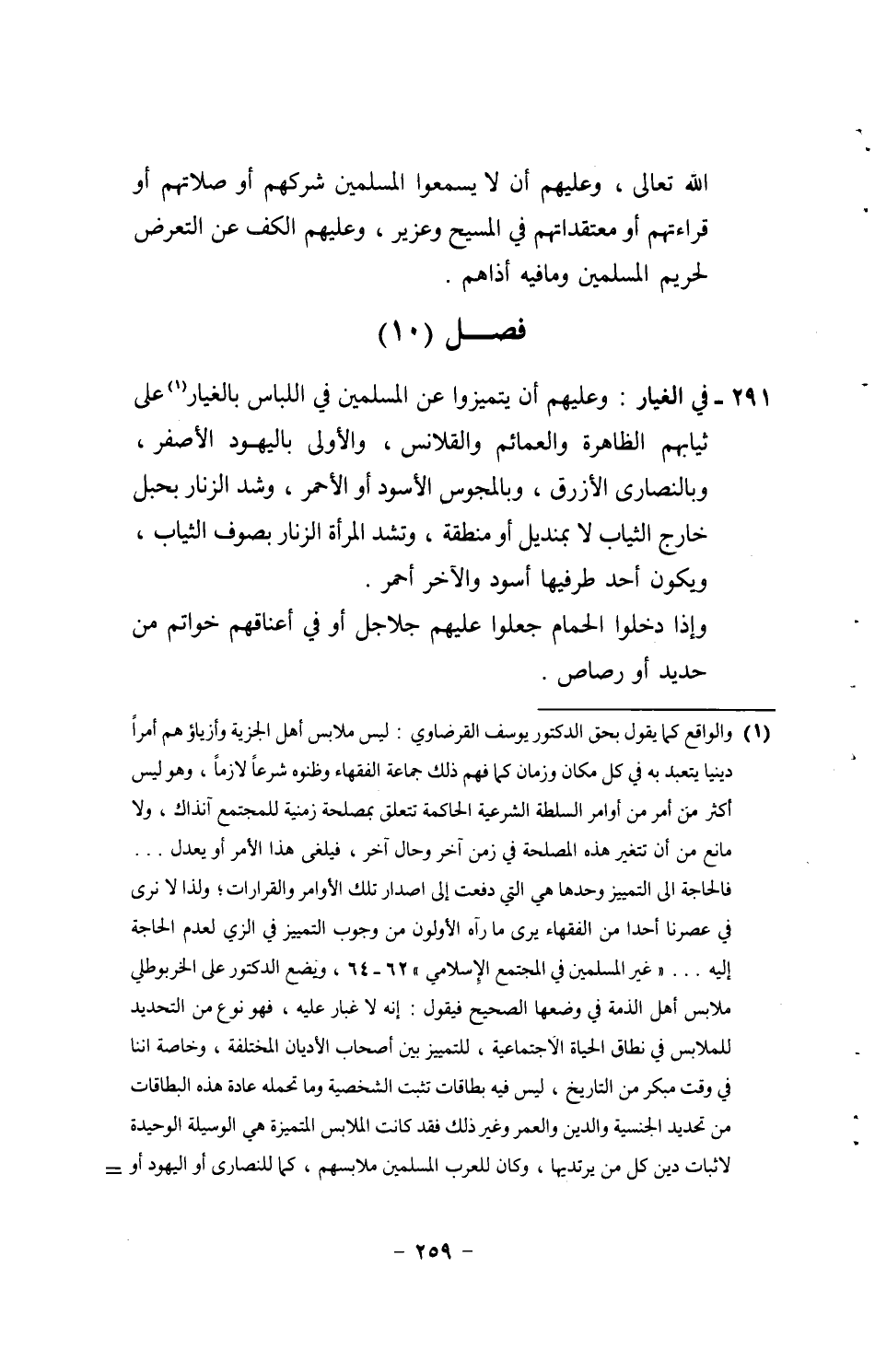291 - فِي الغيار: وَعَلَيْهِم أَن يتميزوا عَن الْمُسلمين فِي اللبَاس بالغيار على ثِيَابهمْ الظَّاهِرَة والعمائم والقلانس، وَالْأولَى باليهود الْأَصْفَر، وبالنصارى الْأَزْرَق، وبالمجوس الْأسود أَو الْأَحْمَر، وَشد الزنار بِحَبل خَارج الثِّيَاب لَا بمنديل أَو منْطقَة، وتشد الْمَرْأَة الزنار بصوف الثِّيَاب، وَيكون أحد طرفيها أسود وَالْآخر أَحْمَر. وَإِذا دخلُوا الْحمام جعلُوا عَلَيْهِم جلاجل أَو فِي أَعْنَاقهم خَوَاتِم من حَدِيد أَو رصاص.