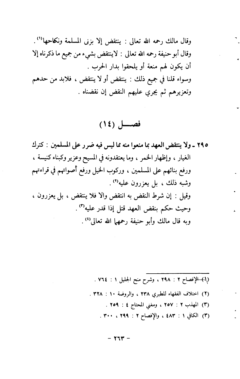 295 - وَلَا ينْتَقض الْعَهْد بِمَا منعُوا مِنْهُ مِمَّا لَيْسَ فِيهِ ضَرَر على الْمُسلمين: كَتَرْكِ الغيار، وَإِظْهَار الْخمر، وَمَا يعتقدونه فِي الْمَسِيح وعزير وكبناء كَنِيسَة، وَرفع بنائهم على الْمُسلمين، وركوب الْخَيل وَرفع أَصْوَاتهم فِي قراءتهم وَشبه ذَلِك، بل يعزرون عَلَيْهِ. وَقيل: إِن شَرط النَّقْض بِهِ انْتقض وَإِلَّا فَلَا ينْتَقض، بل يعزرون، وَحَيْثُ حكم بِنَقْض الْعَهْد قتل إِذا قدر عَلَيْهِ. وَبِه قَالَ مَالك وَأَبُو حنيفَة رحمهمَا الله تَعَالَى.