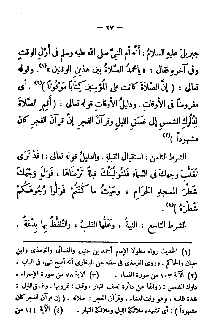 (شروط الصلاة تسعة) الإسلام، والعقل، والتمييز، ورفع الحدث، وإزالة النجاسة، وستر العورة، ودخول الوقت، واستقبال القبلة، والنية.