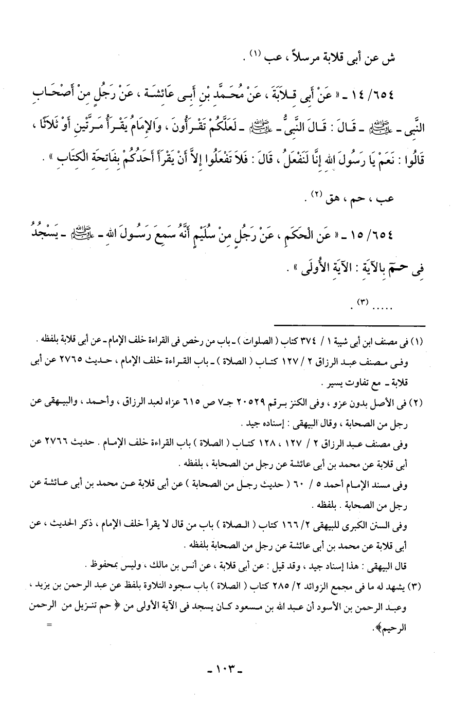 654/ 14 - "عَنْ أَبِي قِلَابَةَ، عَنْ مُحَمَّدِ بْنِ أَبِي عَائِشَة، عَنْ رَجُلٍ مِنْ أَصْحَابِ النَّبِي - صلى الله عليه وسلم - قَالَ: قَالَ النَّبِيُّ - صلى الله عليه وسلم - لَعَلَّكُمْ تَقْرَأُونَ، وَالإِمَامُ يَقْرَأُ مَرَّتْينِ أَوْ ثَلَاثًا، قَالُوا: نَعَمْ يَا رَسُولَ اللهِ إِنَّا لَنَفْعَلُ، قَالَ: فَلَا تَفْعَلُوا إِلَّا أَنْ يَقْرَأَ أَحَدُكُمْ بِفَاتِحَةِ الْكِتَابِ".