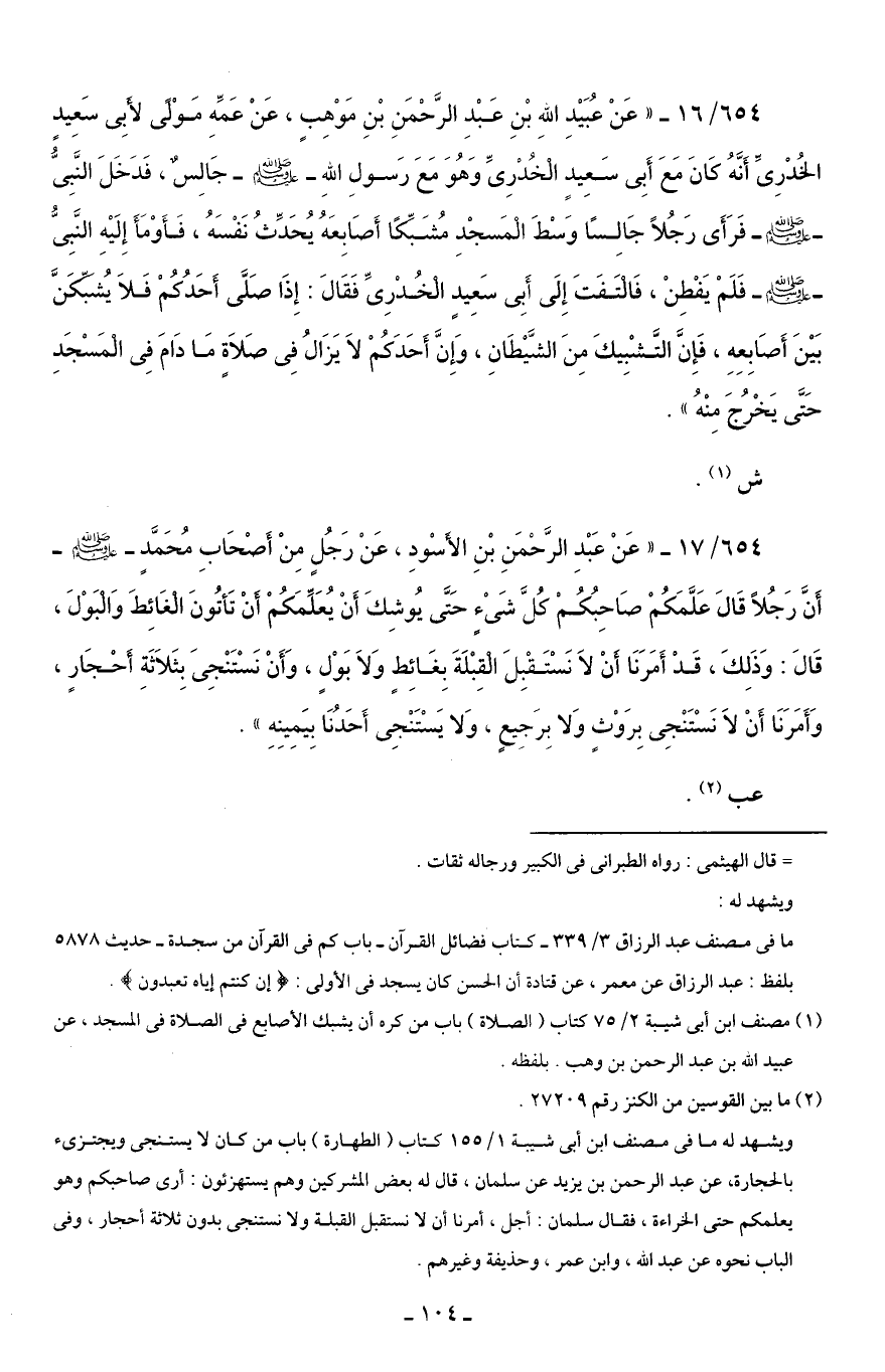 654/ 16 - "عَنْ عُبَيْدِ اللهِ بْنِ عَبْدِ الرَّحْمَنِ بْنِ مَوْهِبٍ، عَنْ عَمِّهِ مَوْلًى لأَبِي سَعِيدٍ الخُدْرِيِّ أَنَّهُ كانَ مَعَ أَبِي سَعِيدٍ الْخُدْرِيِّ وَهُوَ مَعَ رَسولِ اللهِ - صلى الله عليه وسلم - جَالِسٌ، فَدَخَلَ النَّبِيُّ - صلى الله عليه وسلم - فَرَأَى رَجُلًا جَالِسًا وَسْطَ الْمَسجْدِ مُشَبِّكًا أَصَابِعَهُ يُحَدِّثُ نَفْسَهُ، فَأَوْمَأَ إِلَيْهِ النَّبِيُّ - صلى الله عليه وسلم - فَلَمْ يَفْطِنْ، فَالْتَفَتَ إِلَى أَبِي سَعِيدٍ الْخُدْرِيِّ فَقَالَ: إِذَا صَلَّى أَحَدُكُمْ فَلَا يُشَبِّكَنَّ بَيْنَ أَصَابِعِهِ، فَإِنَّ التَّشْبِيكَ مِنَ الشَّيْطَانِ، وَإِنَّ أَحَدَكُمْ لَا يَزَالُ فِي صَلَاةٍ مَا دَامَ فِي الْمَسْجَدِ حَتَّى يَخْرُجَ مِنْهُ".
