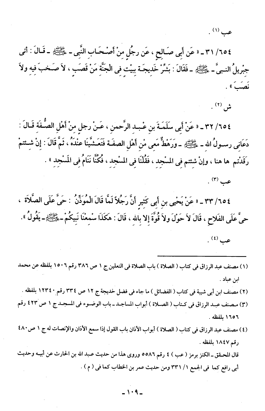 654/ 33 - "عَنْ يَحْيى بنِ أَبِي كَثِيرٍ أَنَّ رَجُلًا لَمَّا قَالَ الْمُوَذِّنُ: حَيَّ عَلَى الصَّلَاة، حيَّ عَلَى الفَلاحِ، قَالَ لَا حَوْلَ ولَا قُوَّةَ إِلا بِاللهِ، قَالَ: هَكَذَا سْمِعْنَا نَبِيكُمْ - صلى الله عليه وسلم - يَقُولُ".