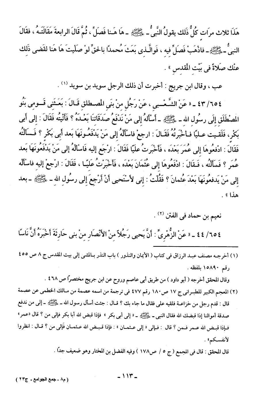 654/ 43 - "عَنْ الشَّعْبي، عَنْ رَجُلِ مِنْ بنَي الْمصطلقِ قَالَ: بَعَثَنِي قَومِي بَنُو المصْطَلَقِ إِلَى رسُولِ اللهِ - صلى الله عليه وسلم - أَسْأَلهُ إِلى مَنْ نَدْفَعُ صَدَقَاتِنَا بَعْدَهُ؟ فَأَتْيتُه فَقَالَ: إِلى أَبي بَكْرٍ، فَلَقيت عليًا فأخْبَرتُهُ فَقَالَ: ارجعْ فاسْأَلْهُ إِلى مَنْ يَدْفَعُونَهَا بَعد أَبِي بَكْرٍ؟ فَسَألْتُه فَقَالَ: ادْفعُوهَا إِلى عُمَرَ بَعْدَه، فَأَخْبَرتُ علَيًا فَقَالَ: ارْجَع إليه فَاسْألْهُ إلى مَنْ يَدْفَعُونَهَا بَعد عُمَر؟ فَسَأَلْتُه، فَقَالَ: ادْفَعُوهَا إِلى عُثَمَانَ بَعْدَه، فَأَخْبَرْتُ عَلِيًا، فَقَالَ: ارْجعْ إليهِ فاسْأَلْه إِلى مَنْ يَدفعُونَهَا بَعْدَ عُثمانَ؟ فَقُلْتُ: إِني لأَسْتَحيى أَنْ أَرْجِعَ إِلى رسُولِ اللهِ - صلى الله عليه وسلم - بعد هذا".