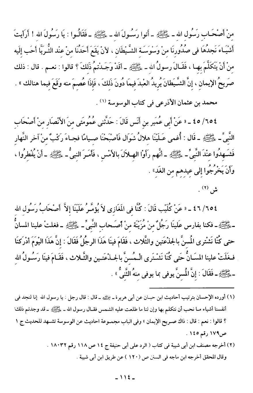 (¬1) أورده الإحسان بترتيب أحاديث ابن حبان عن أبي هريرة - رضي الله عنه - قال: قال رجل: يا رسول الله إنا لنجد في أنفسنا أشياء ما نحب أن نتكلم بها وإن لنا ما طلعت عليه الشمس فقال رسول الله - صلى الله عليه وسلم - قد وجدتم ذلك؟ قالوا: نعم: قال: ذاك صريح الإيمان" وفي الباب مجموعة أحاديث عن الوسوسة تشهد للحديث ج 1 ص 179 رقم 145.