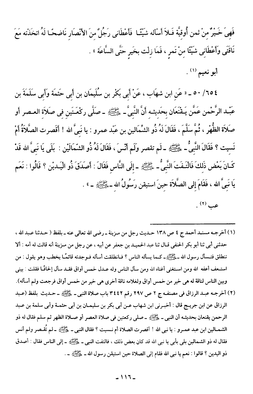 654/ 50 - "عَنِ ابن شهَاب، عَنْ أَبِي بَكْرٍ بن سُلَيمَان بن أَبِي حَثمَة وَأَبِي سَلَمَةَ بن عَبْد الرَّحْمن عَمَّن يَقْنَعَان بِحَدِيثهِ أَنَّ النَّبِيَّ - صلى الله عليه وسلم - صَلَّى ركْعَتَينِ فِي صَلَاةِ العصر أَو صَلَاة الظُّهْر، ثُمَّ سَلَّمَ، فَقَالَ لَهُ ذُو الشِّمَالين بن عَبْد عمرو: يا نَبِيَّ الله! أَقَصرت الصَّلَاةُ أَمْ نَسِيت؟ فَقَالَ النَّبِيُّ - صلى الله عليه وسلم - لَم تقصر وَلَم أَنْسَ، فَقَالَ لَهُ ذُو الشّمَالَيْن: بَلَى يَا نَبِيَّ الله قَدْ كَانَ بَعْض ذَلِكَ فَالْتَفَتَ النَّبِيُّ - صلى الله عليه وسلم - إِلَى النَّاسِ فَقَالَ: أَصَدَقَ ذُو الْيَديْن؟ قَالُوا: نَعَم يَا نَبِيَّ الله، فَقَامَ إِلى الصَّلَاة حِينَ استيقن رَسُولُ اللهِ - صلى الله عليه وسلم -".