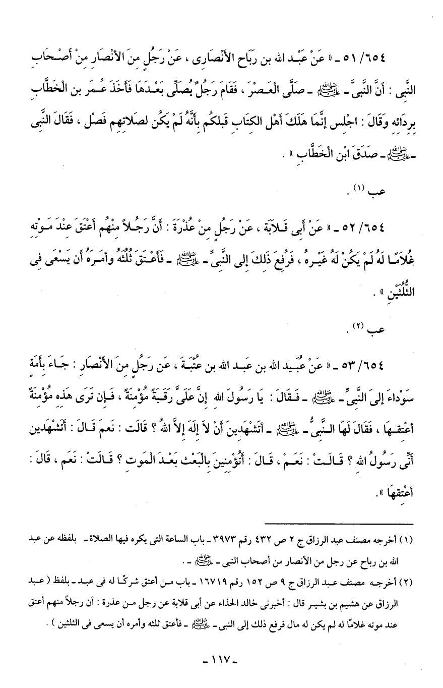 654/ 53 - "عَنْ عُبَيد الله بن عَبد الله بن عُتْبَةَ، عَن رَجُلٍ مِنَ الأَنْصَارِ: جَاءَ بِأَمَةٍ سَوْداءَ إلىَ النَّبِيِّ - صلى الله عليه وسلم - فَقَالَ: يَا رَسُولَ اللهِ إِنَّ عَلَيَّ رَقَبَةً مُؤْمِنَةً، فَإِن تَرَى هَذِهِ مُؤْمِنَةً أعْتِقهَا، فَقَالَ لَهَا النَّبِيُّ - صلى الله عليه وسلم - أتَشْهَدِينَ أَنْ لَا إِلَهَ إِلَّا اللهُ؟ قَالَت: نَعمَ قَالَ: أَتَشْهَدين أَنِّي رَسُولُ اللهِ؟ قَالَتْ: نَعَمْ، قَالَ: أَتُؤْمِنِينَ بِالْبَعْث بَعْدَ الْمَوتِ؟ قَالَتْ: نَعَم، قَالَ: أعْتِقهَا".