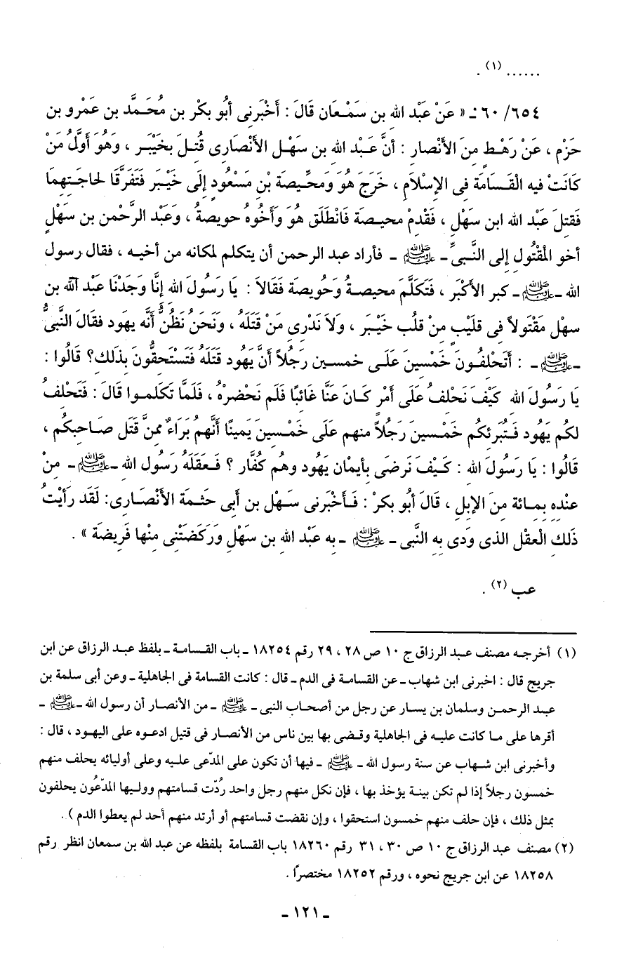 654/ 60: "عَنْ عَبْد اللهِ بن سَمْعَان قَالَ: أَخْبَرنِي أبُو بكْر بن مُحَمَّد بن عَمْرو بن حَزْم، عَنْ رَهْطٍ مِنَ الأَنْصارِ: أنَّ عَبْد اللهِ بن سَهْل الأَنْصَارِي قُتِلَ بخَيْبَر، وَهُوَ أَوَّلُ مَنْ كَانَتْ فيه الْقَسَامَة فِي الإِسْلَامِ، خَرَجَ هُوَ وَمحِّيصَة بْنِ مَسْعُودٍ إِلَى خَيْبَر فَتَفَرَّقَا لحاجَتِهِمَا فَقتِلَ عَبْد الله ابن سَهْلِ، فَقْدِمْ محيصَة فَانْطَلَق هُوَ وَأَخُوهُ حويصةُ، وَعَبْد الرَّحْمن بن سَهْلٍ أخو الْمقْتُولِ إِلى النَّبيِّ - صلى الله عليه وسلم - فأراد عبد الرحمن أن يتكلم لمكانه من أخيه، فقال رسول الله - صلى الله عليه وسلم - كبر الأَكْبَر، فَتَكَلَّمَ محيصةُ وَحُويصَة فَقَالَا: يَا رَسُولَ اللهِ إِنَّا وَجَدْنَا عَبْد الله بن سهْل مَقْتَولًا فِي قلَيْبٍ مِنْ قلُب خَيْبَر، وَلاَ نَدْرِي مَنْ قَتَلَهُ، وَنَحَنُ نَظُنُّ أَنَّه يهَود فقَالَ النَّبيُّ - صلى الله عليه وسلم -: أَتَحْلِفُونَ خَمْسِينَ عَلَى خمسين رَجُلًا أَنَّ يَهُود قَتَلَهُ فَتَسْتَحِقُّونَ بِذَلكِ؟ قَالُوا: يَا رَسُولَ اللهِ كَيْفَ نَحْلِفُ عَلَى أَمْرٍ كَانَ عَنَّا غَائِبًا فَلَم نَحْضرْهُ، فَلَمَّا تَكَلموا قَالَ: فَتَحْلِفُ لكُم يَهُود فَتُبَرئِكُم خَمْسينَ رَجُلًا منهم عَلَى خَمْسِينَ يَمينًا أَنَّهمُ بَرَاءٌ مِمَّن قَتَل صَاحِبكُم، قَالُوا: يَا رَسُولَ اللهِ: كَيْفَ نَرضَى بِأيمْان يَهُود وهُم كُفَّار؟ فَعَقَلَهُ رَسُول اللهِ - صلى الله عليه وسلم - مِنْ عنْدِهِ بِمِائة مِنَ الإبِلِ، قَالَ أبُو بكرْ: فَأَخْبَرني سَهْل بن أَبِي حَثمَة الأَنْصَارِي: لَقَد رَأيْتُ ذَلكِ الْعَقْل الذي وَدى بِهِ النَّبي - صلى الله عليه وسلم - بِه عَبْد اللهِ بن سَهْلِ وَرَكَضَتْنِى مِنْها فَرِيضَة".