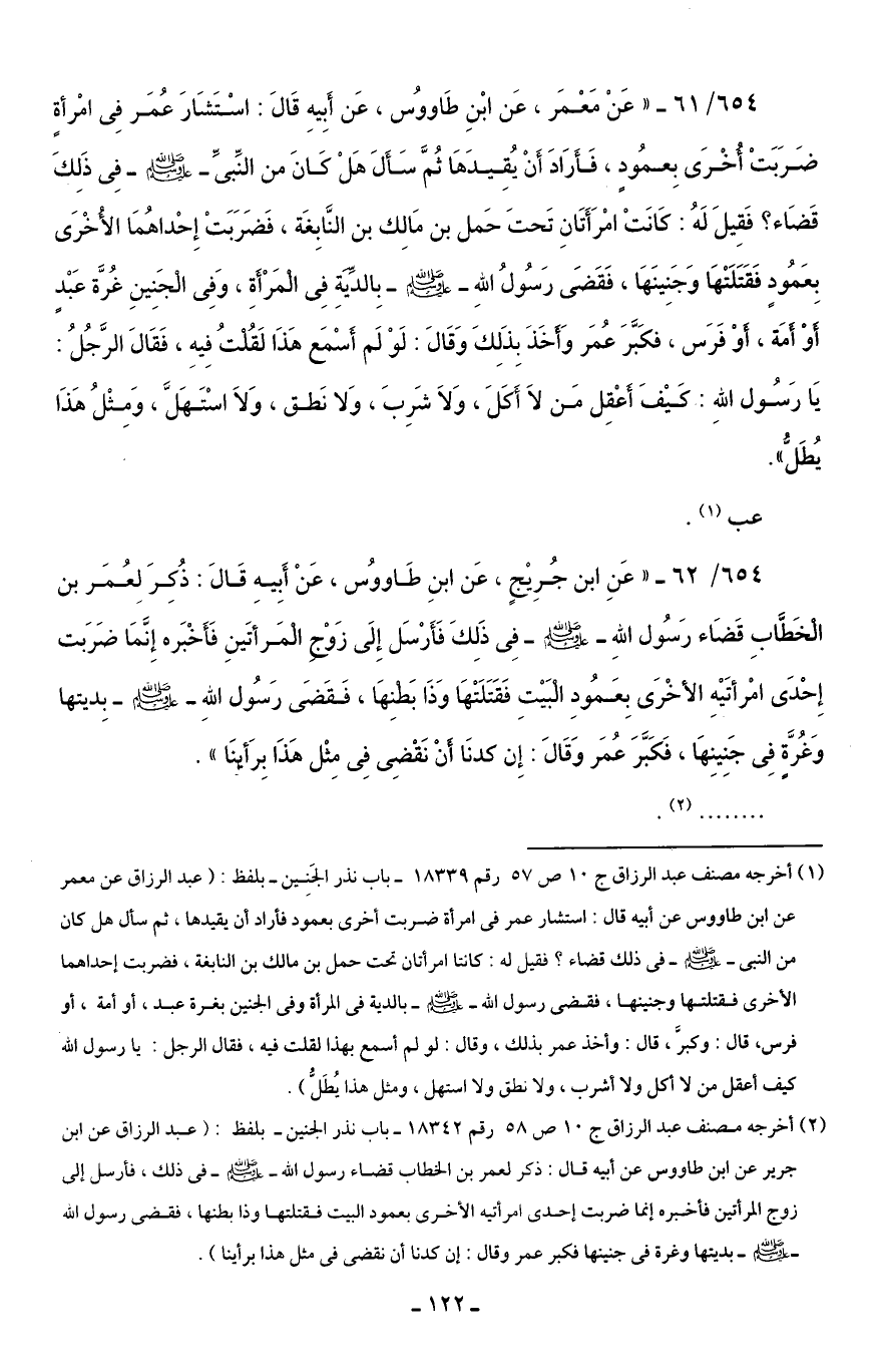 654/ 61 - "عَنْ مَعْمَر، عَن ابْنِ طَاووسُ، عَن أَبِيهِ قَالَ: اسْتَشَارَ عُمَر فِي امْرأةٍ ضَرَبَتْ أُخْرَى بِعمُودٍ، فَأَرَادَ أَنْ يُقِيدَهَا ثُمَّ سَأَلَ هَلْ كانَ من النِّبيِّ - صلى الله عليه وسلم - فِي ذَلِكَ قَضَاء؟ فَقِيلَ لَهُ: كَانَتْ امْرَأَتَانِ تَحتَ حَمل بن مَالِك بن النَّابِغَة، فَضَرَبَتْ إِحْداهُمَا الأُخْرَى بِعَمُودٍ فَقَتَلَتْهَا وَجَنِينَهَا، فَقَضَى رَسُولُ اللهِ - صلى الله عليه وسلم - بِالدِّيَةِ فِي الْمَرْأَةِ، وَفِي الْجَنِينِ غُرَّة عَبْدٍ أَوْ أَمَة، أَوْ فَرَس، فكَبَّرَ عُمَر وَأَخَذَ بِذَلِكَ وَقَالَ: لَوْ لَم أَسْمَع هَذَا لَقُلْتُ فِيهِ، فَقَالَ الرَّجُلُ: يَا رَسُول اللهِ: كَيْفَ أَعْقِل مَن لَا أَكَلَ، وَلاَ شَرِبَ، وَلا نَطق، وَلاَ اسْتَهَلَّ، وَمِثْلُ هَذَا يُطَلُّ".