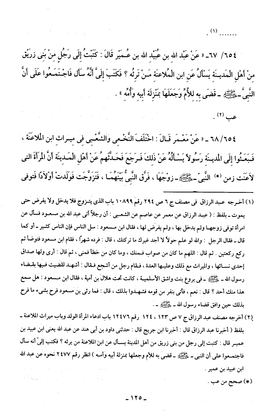 654/ 68 - "عَنْ مَعْمَر قَالَ: اخْتَلَفَ النَّخْعِي والشَّعْبِي فِي مِيراثِ ابن الْملاعَنَة، فَبَعَثُوا إِلَى الْمدينَةِ رَسُولًا يَسْأَلُهُ عَنْ ذَلِكَ فَرَجَعَ فَحَدَّثَهمُ عَنْ أَهْلِ الْمَدِينَة أَنَّ الْمرَأَةَ التي لاَعَنَت زمن (*) النَّبيّ - صلى الله عليه وسلم - زوْجَهَا، فَرَّق النَّبِيُّ بَيْنَهُمَا، فَتَزَوَّجَت فَوَلَدتْ أَوْلَادًا فَتوفي