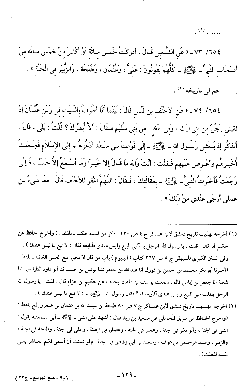 654/ 73 - "عَنِ الشَّعبِي قَالَ: أدركْتُ خَمس مِائَةٍ أَوْ أَكْثَرَ مِنْ خَمْس مائَة مِنْ أَصْحَابِ النَّبِيِّ - صلى الله عليه وسلم - كُلُّهُمْ يَقُولُونَ: عَلِيٌّ، وَعُثْمَان، وَطَلْحَة، وَالزُّبَيْر فِي الْجَنَّةِ".