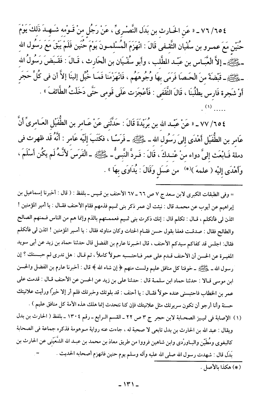 654/ 77 - "عَنْ عَبْد اللهِ بن بُرَيْدَةَ قَالَ: حَدَّثَنِي عَنْ عَامِر بن الطُّفَيْلِ العَامِريِّ أَنَّ عَامِر بن الطُّفَيْل أَهْدَى إِلىَ رَسُولِ اللهِ - صلى الله عليه وسلم - فَرَسًا، فكَتَبَ إِلَيْه عَامِر: أَنَّهُ قَد ظهرت في دملة فَابْعَث إِليَّ دواء مِنْ عْنِدِكَ، قَالَ: فَردَّ النَّبِيُّ - صلى الله عليه وسلم - الْفَرَسَ لأَنَّهُ لَم يكُن أَسْلَمَ، وَأَهْدَى إِليْه (علمهَ) (*) من عَسَلٍ وَقَالَ: يُدَاوَى بِهَا".