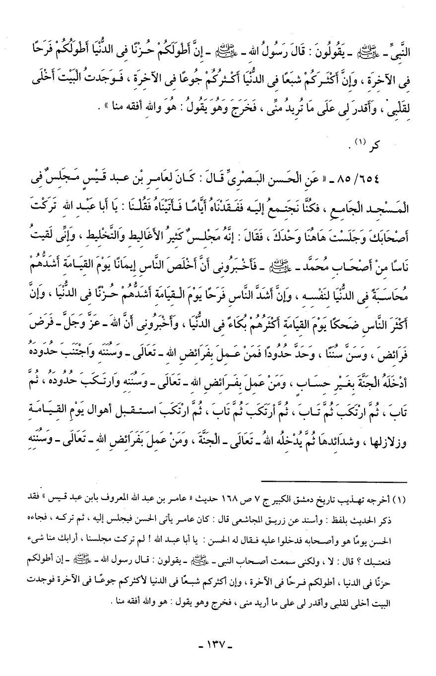 654/ 85 - "عَنِ الْحَسن البَصْرِيِّ قَالَ: كَانَ لِعَامِرِ بْن عبد قَيْسٍ مَجَلِسٌ فِي الْمَسْجِد الْجَامِعِ، فكُنَّا نَجَتِمعُ إليَه فَفَقَدْنَاهُ أَيَّامًا فَأَتَيْنَاهُ فَقُلْنَا: يَا أَبا عَبْدِ اللهِ تَرَكْتَ أَصْحَابَكَ وَجَلَسْتَ هَاهُنَا وَحْدَكَ، فَقَالَ: إنَّهُ مَجْلِسٌ كَثِيرُ الأَغَالِيطِ وَالتَّخْلِيطِ، وَإِنِّي لَقيتُ نَاسًا مِنْ أَصْحَابِ مُحَمَّد - صلى الله عليه وسلم - فَأَخْبَرُونِي أَنَّ أَخْلَصَ النَّاسِ إِيمَانًا يَوْمَ القِيَامَةِ أَشَدُّهُمْ مُحَاسَبَةً فِي الدُّنْيَا لِنَفْسِهِ، وَإنَّ أَشَدَّ النَّاسِ فَرَحًا يَوْمَ الْقِيَامَةِ أَشَدُّهُمْ حُزْنًا فِي الدُّنْيَا، وَإنَّ أَكْثَرَ النَّاسِ ضَحكًا يَوْمَ القِيَامَةِ أَكْثَرُهُمْ بُكَاءً فِي الدُّنْيَا، وَأَخْبَرُونِي أنَّ اللهَ - عَزَّ وَجَلَّ- فَرَضَ فَرَائِضَ، وَسَنَّ سُنَنًا، وَحَدَّ حُدُودًا فَمَنْ عَمِلَ بِفَرَائِضِ اللهِ - تَعَالَى- وَسُنَنَهِ وَاجْتَنَبَ حُدَودَهُ أدْخَلَهُ الْجَنَّةَ بِغَيْرِ حِسَابٍ، وَمَنْ عَمِلَ بِفَرَائِضِ اللهِ - تَعَالَى- وَسُنَنِهِ وَارتَكَبَ حُدُودَهُ، ثُمَّ تَابَ، ثُمَّ ارْتَكَبَ ثُمَّ تَابَ، ثُمَّ اْرَتَكَبَ ثُمَّ تَابَ، ثُمَّ ارْتَكَبَ استقبل أهوال يَوْمِ القِيَامَةِ وزلازلها، وشدَائِدهَا ثُمَّ يُدْخِلُه اللهُ - تَعَالَى- الْجَنَّةَ، وَمَنْ عَمِلَ بَفَرَائِضِ اللهِ - تَعَالَى- وَسُنَنِهِ