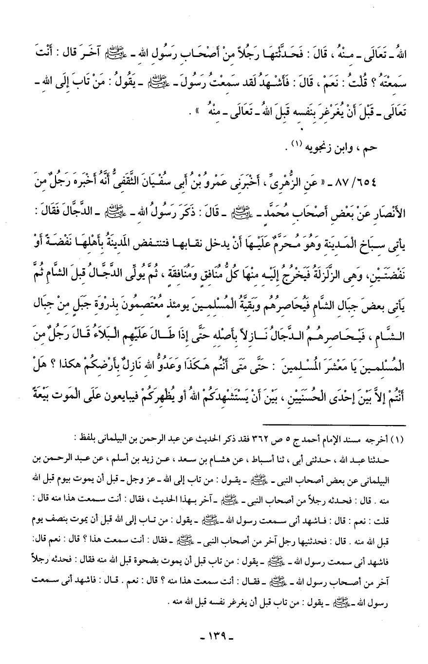 654/ 87 - "عَنِ الزُّهْرِيِّ، أَخْبَرَنِي عَمْروُ بْنُ أَبِي سُفْيَانَ الثَّقَفِيُّ أَنَّهُ أخْبَرهَ رَجُلٌ مِنَ الأَنْصَارِ عَنْ بَعْضِ أَصْحَابِ مُحَمَّدٍ - صلى الله عليه وسلم - قَالَ: ذَكَرَ رَسُولُ اللهِ - صلى الله عليه وسلم - الدَّجَّالَ فَقَالَ: يأتِي سِبَاخ الْمَدِيَنةِ وَهُوَ مُحَرَّمٌ عَلَيْهَا أَنْ يدخل نقابها فتنتفض المَدِينَةُ بِأَهْلِهَا نَفْضَةً أَوْ نَفْضَتَيْنِ، وَهِي الزَّلَزلَةُ فَيَخْرُجُ إِلَيْهِ مِنْهَا كُلُّ مُنَافِقٍ وَمُنَافِقَةٍ، ثُمَّ يُولِّي الدَّجَّالُ قِبلَ الشَّامِ ثُمَّ يَأتِي بعضَ جِبَالِ الشَّامِ فَيُحَاصِرُهُم وَبَقِيَّةُ الْمُسْلِمِينَ يومئذٍ مُعْتَصِمُونَ بِذرْوَةِ جَبَلٍ مِنْ جِبَال الشَّامِ، فَيْحَاصِرهُمُ الدَّجَالُ نَازِلًا بِأَصْلِهِ حَتَّى إِذَا طَالَ عَلَيْهِم الْبَلَاءُ قَالَ رَجُلٌ مِنَ الْمُسْلِمينَ يَا مَعْشَرَ المُسْلِمينَ: حَتَّى مَتَى أَنْتُم هَكَذَا وَعَدُوُّ اللهِ نَازِلٌ بِأَرْضِكُمْ هكذا؟ هَلْ أَنْتُمْ إلَّا بَيْنَ إحْدَى الْحُسَنَييْنِ، بَيْنَ أَنْ يَسْتَشْهِدَكُمْ اللهُ أو يُظْهِرَكُمْ فيبايعون عَلَى الْمَوت بَيْعَةً