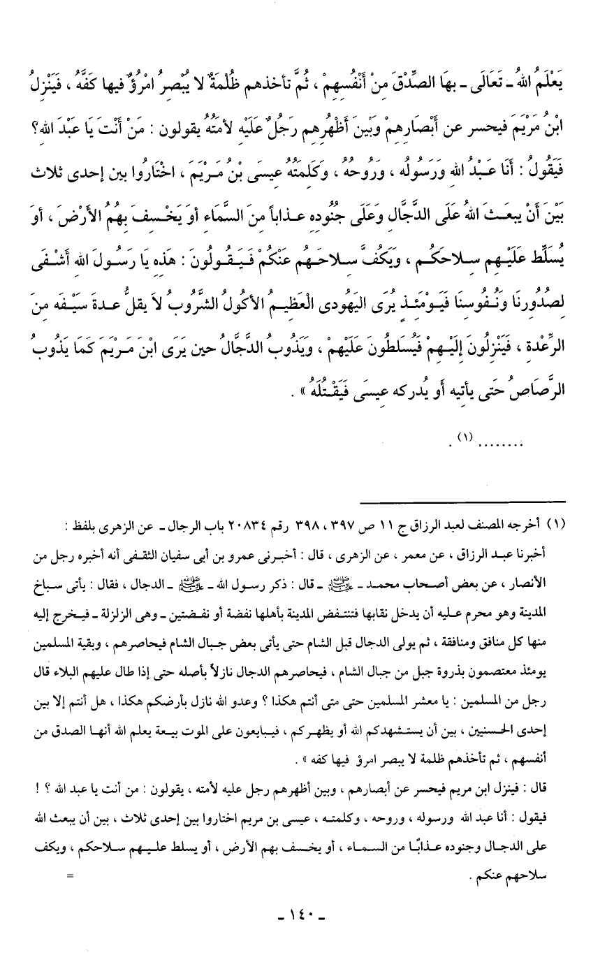أخبرنا عبد الرزاق، عن معمر، عن الزهري، قال: أخبرني عمرو بن أبي سفيان الثقفي أنه أخبره رجل من الأنصار، عن بعض أصحاب محمد - صلى الله عليه وسلم - قال: ذكر رسول الله - صلى الله عليه وسلم - الدجال، فقال: يأتي سباخ المدينة وهو محرم عليه أن يدخل نقابها فتنتفض المدينة بأهلها نفضة أو نفضتين - وهي الزلزلة- فيخرج إليه منها كل منافق ومنافقة، ثم يولي الدجال قبل الشام حتى يأتي بعض جبال الشام فيحاصرهم، وبقية المسلمين يومئذ معتصمون بذروة جبل من جبال الشام، فيحاصرهم الدجال نازلًا بأصله حتى إذا طال عليهم البلاء قال رجل من المسلمين: يا معشر المسلمين حتى متى أنتم هكذا؟ وعدو الله نازل بأرضكم هكذا، هل أنتم إلا بين إحدى الحسنيين، بين أن يستشهدكم الله أو يظهركم، فيبايعون على الموت بيعة يعلم الله أنها الصدق من أنفسهم، ثم تأخذهم ظلمة لا يبصر امرؤ فيها كفه".