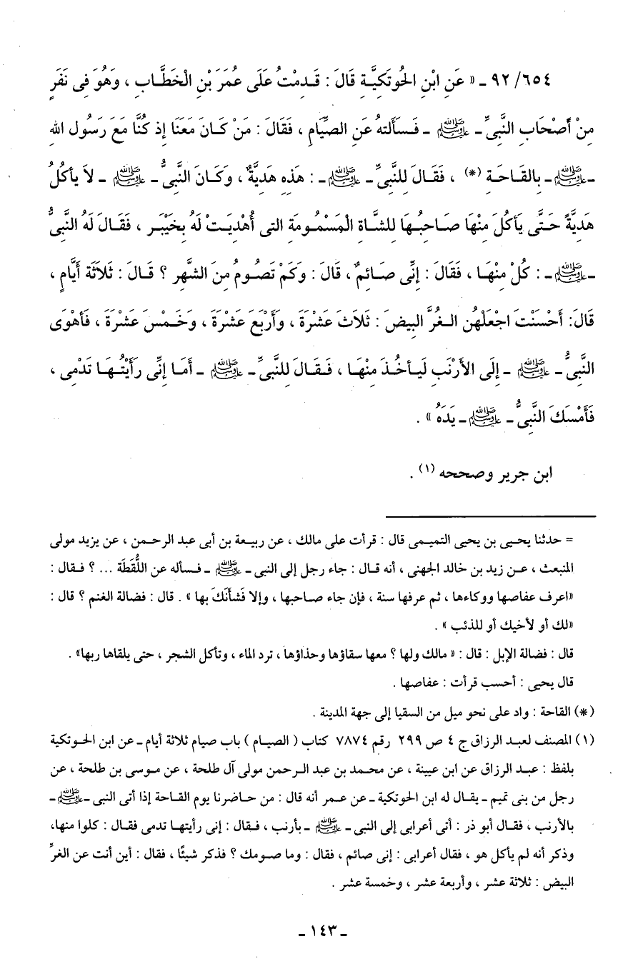 654/ 92 - "عَنِ ابْنِ الحُوتَكِيَّةِ قَالَ: قَدِمْتُ عَلَى عُمَرَ بْنِ الْخَطَّابِ، وَهُوَ فِي نَفَرٍ مِنْ أَصْحَابِ النَّبِيِّ - صلى الله عليه وسلم - فَسَأَلتهُ عَنِ الصِّيَامِ، فَقَالَ: مَنْ كَانَ مَعَنَا إِذ كُنَّا مَعَ رَسُول اللهِ - صلى الله عليه وسلم - بِالقَاحَةِ (*)، فَقَالَ لِلنَّبِيِّ - صلى الله عليه وسلم -: هَذِهِ هَدِيَّةٌ، وَكَانَ النَّبِيُّ - صلى الله عليه وسلم - لَا يأكُلُ هَدِيَّةً حَتَّى يَأكُلَ مِنْهَا صَاحِبُهَا لِلشَّاةِ الْمَسْمُومَةِ التي أُهْدِيَتْ لَهُ بِخَيْبَر، فَقَالَ لَهُ النَّبِيُّ - صلى الله عليه وسلم -: كُلْ مِنْهَا، فَقَالَ: إِنِّي صَائِمٌ، قَالَ: وَكَمْ تَصُومُ مِنَ الشَّهِر؟ قَالَ: ثَلَاثَة أَيَّامٍ، قَالَ: أَحْسَنْتَ اجْعَلْهُن الغُرَّ البِيضَ: ثَلاَثَ عَشْرَةَ، وَأَرْبَعَ عَشْرَةَ، وَخَمْسَ عَشْرَةَ، فَأهْوَى النَّبِيُّ - صلى الله عليه وسلم - إِلَى الأَرْنَبِ لَيأخُذَ مِنْهَا، فَقَالَ لِلنَّبيِّ - صلى الله عليه وسلم - أَمَا إِنِّي رَأَيْتُهَا تَدْمِي، فَأَمْسَكَ النَّبِيُّ - صلى الله عليه وسلم - يَدَهُ".