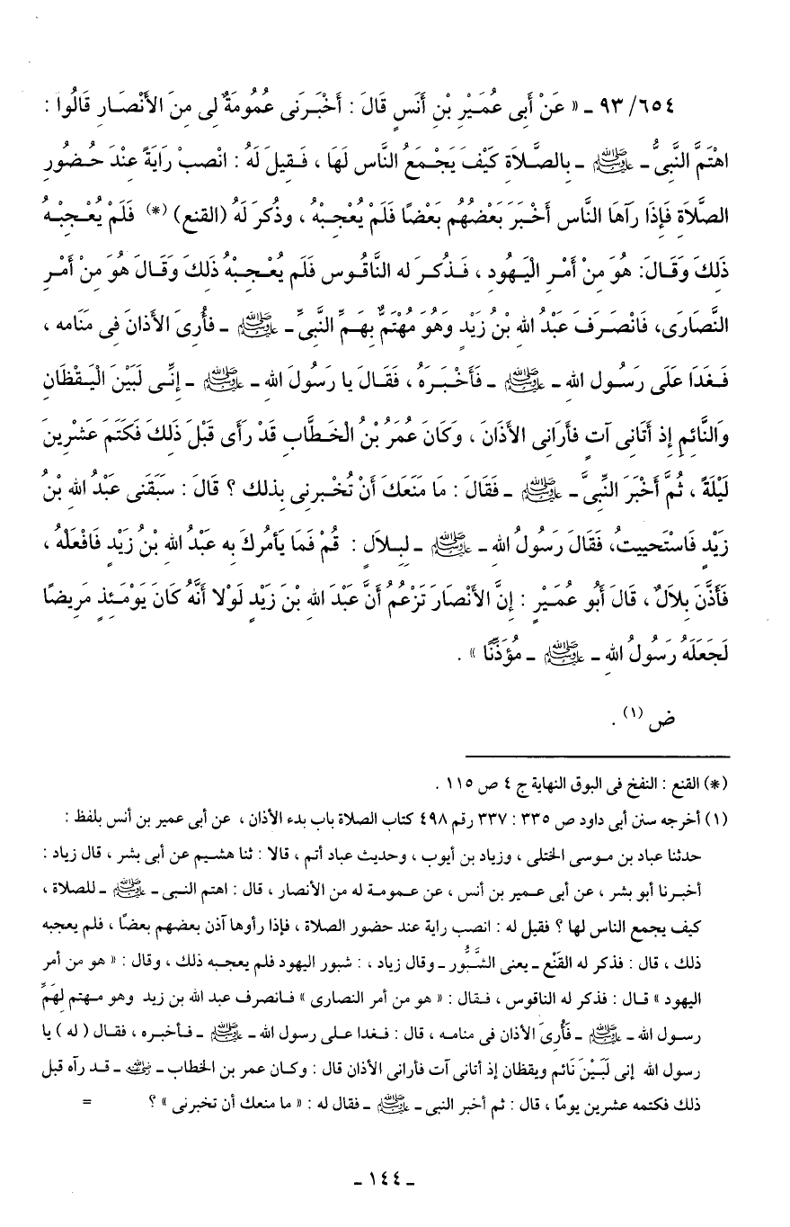 654/ 93 - "عَنْ أَبِي عُمَيْرِ بْنِ أَنَسٍ قَالَ: أَخْبَرَني عُمُومَةٌ لِي مِنَ الأَنْصَارِ قَالُوا: اهْتَمَّ النَّبِيُّ - صلى الله عليه وسلم - بِالصَّلَاةِ كَيْفَ يَجْمَعُ النَّاس لَهَا، فَقِيلَ لَهُ: انْصبْ رَايَةً عِنْدَ حُضُورِ الصَّلَاةِ فَإِذَا رآهَا النَّاس أَخْبَرَ بَعْضُهُم بَعْضًا فَلَمْ يُعْجِبْهُ، وذُكرَ لَهُ (القنع) (*) فَلَمْ يُعْجِبْهُ ذَلِكَ وَقَالَ: هُوَ مِنْ أَمْرِ الْيَهُودِ، فَذُكرَ له النَّاقُوس فَلَم يُعْجِبْهُ ذَلِكَ وَقَالَ هُوَ مِنْ أَمْرِ النَّصَارَى، فَانْصَرَفَ عَبْدُ اللهِ بْنُ زَيْدٍ وَهُوَ مُهْتَمٌّ بِهَمِّ النَّبِيِّ - صلى الله عليه وسلم - فأُرِيَ الأَذانَ فِي مَنَامه، فَغَدَا عَلَى رَسُول اللهِ - صلى الله عليه وسلم - فَأَخْبَرَهُ، فَقَالَ يا رَسُولَ اللهِ - صلى الله عليه وسلم - إِنِّي لَبَيْنَ الْيَقْظَانِ وَالنَّائِم إِذ أَتَانِي آتٍ فأَرَانِي الأَذَانَ، وَكَانَ عُمَرُ بْنُ الْخَطَّابِ قَدْ رَأَى قَبْلَ ذَلِكَ فَكَتَمَ عَشْرِينَ لَيْلَةً، ثُمَّ أَخْبَرَ النَّبِيِّ - صلى الله عليه وسلم - فَقَالَ: مَا مَنَعَكَ أَنْ تُخْبرنِي بِذلك؟ قَالَ: سَبَقَني عَبْدُ اللهِ بْنُ زَيْدٍ فَاسْتَحييتُ، فَقَالَ رَسُولُ اللهِ - صلى الله عليه وسلم - لِبِلَالٍ: قُمْ فَمَا يَأمُركَ بِه عَبْدُ اللهِ بْنُ زَيْدٍ فَافْعَلْهُ، فَأَذَّنَ بِلَالٌ، قَالَ أَبُو عُمَيْرٍ: إِنَّ الأَنْصَارَ تَزْعُمُ أَنَّ عَبْدَ اللهِ بْنَ زَيْدٍ لَوْلا أَنَّهُ كَانَ يَوْمَئِذٍ مَرِيضًا لَجَعَلَهُ رَسُولُ اللهِ - صلى الله عليه وسلم - مُؤَذِّنًا".