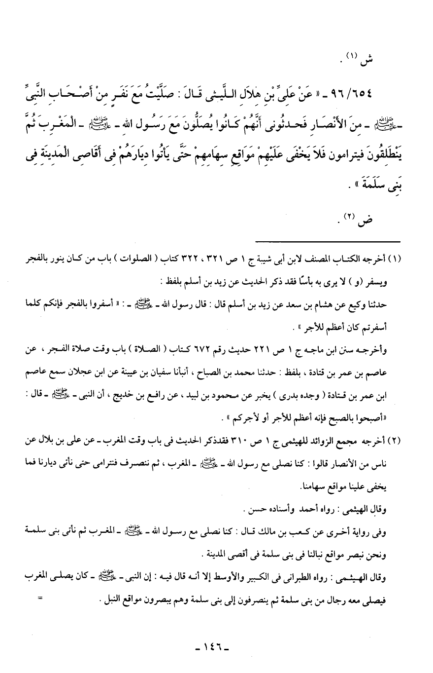654/ 96 - "عَنْ عَلِيِّ بْنِ هِلَالِ اللَّيثي قَالَ: صَلَّيْتُ مَعَ نَفَرٍ مِنْ أَصْحَابِ النَّبِيِّ - صلى الله عليه وسلم - مِنَ الأَنْصَارِ فَحدثُوني أَنَّهُمْ كَانُوا يُصَلُّونَ مَعَ رَسُول اللهِ - صلى الله عليه وسلم - الْمَغْرِبَ ثُمَّ يَنْطَلِقُونَ فيترامون فَلاَ يَخْفَى عَلَيْهِمْ مَوَاقِعِ سِهَامِهِمْ حَتَّى يَأتُوا دِيَارَهُمْ فِي أَقَاصِي الْمَدِينَةِ فِي بَنِي سَلَمَةَ".