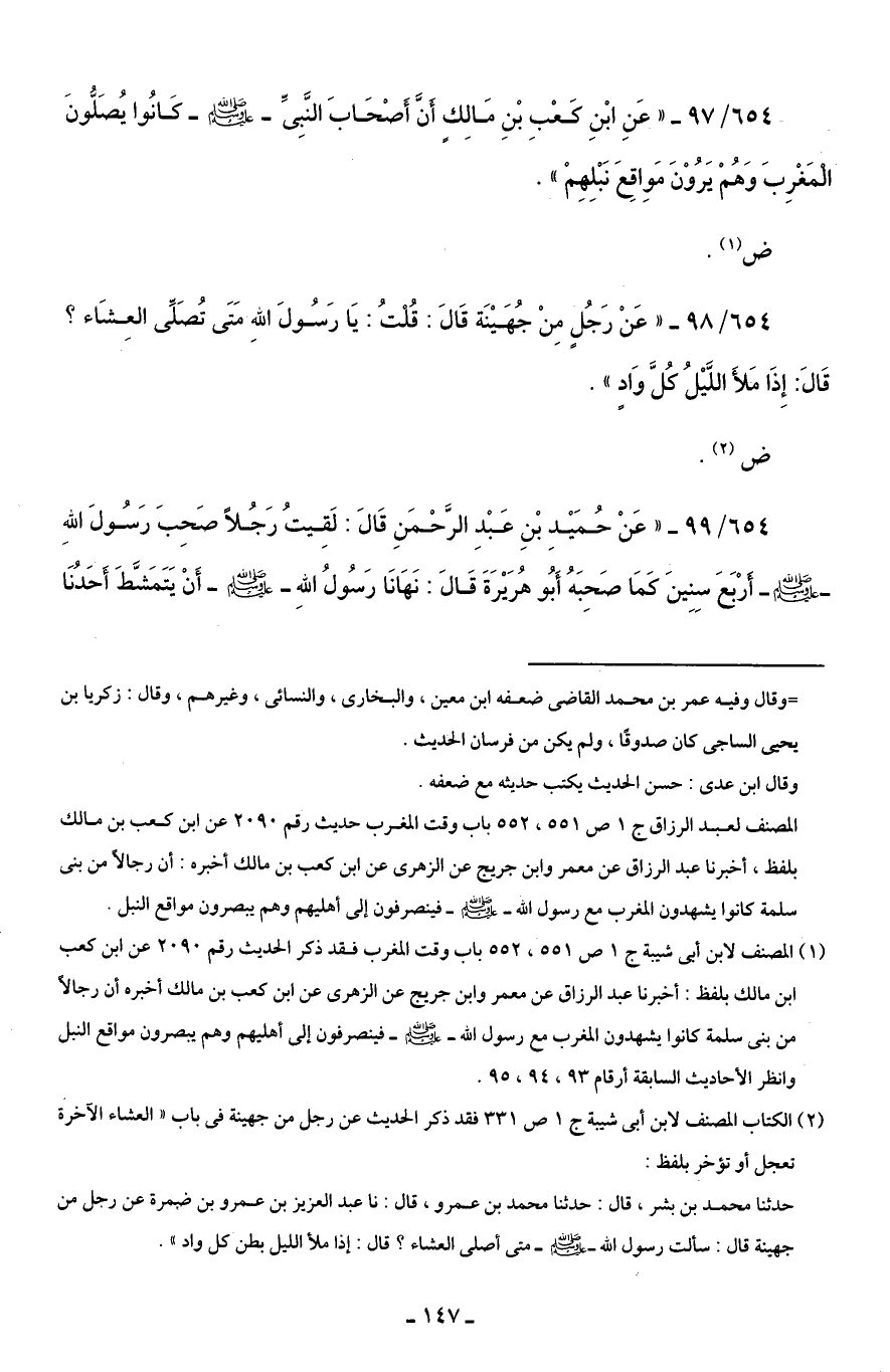 654/ 97 - "عَنِ ابْنِ كَعْبِ بْنِ مَالِكٍ أَنَّ أَصْحَابَ النَّبِيِّ - صلى الله عليه وسلم - كَانُوا يُصَلُّونَ الْمَغْرِبَ وَهُمْ يَرُوْنَ مَوِاقِعَ نَبْلِهِمْ".
