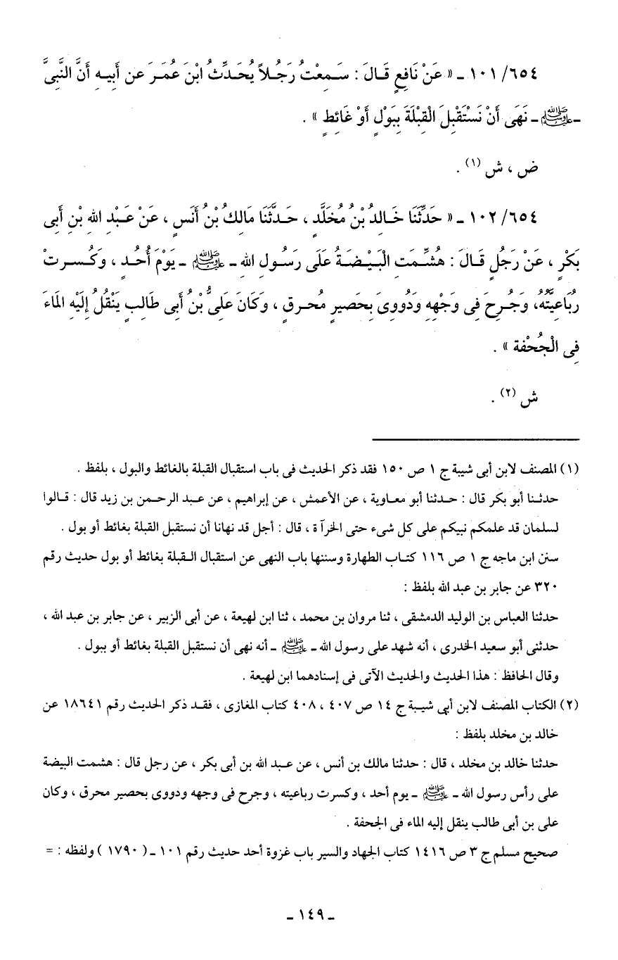 654/ 102 - "حَدَّثَنَا خَالِدُ بْنُ مُخَلَّدٍ، حَدَّثَنَا مَالِكُ بْنُ أَنَسٍ، عَنْ عَبْدِ اللهِ بْنِ أَبِي بَكْرٍ، عَنْ رَجُلٍ قَالَ: هُشِّمَتِ الْبَيْضَةُ عَلَى رَسُولِ اللهِ - صلى الله عليه وسلم - يَوْمَ أُحُدٍ، وَكُسرتْ رُبَاعِيَّتُهُ، وَجُرِحَ فِي وَجْهِهِ وَدُووِيَ بِحَصيرٍ مُحرقٍ، وَكَانَ عَلِيُّ بْنُ أَبِي طَالِبٍ يَنْقُلُ إِلَيْهِ المَاءَ فِي الْجُحْفة".