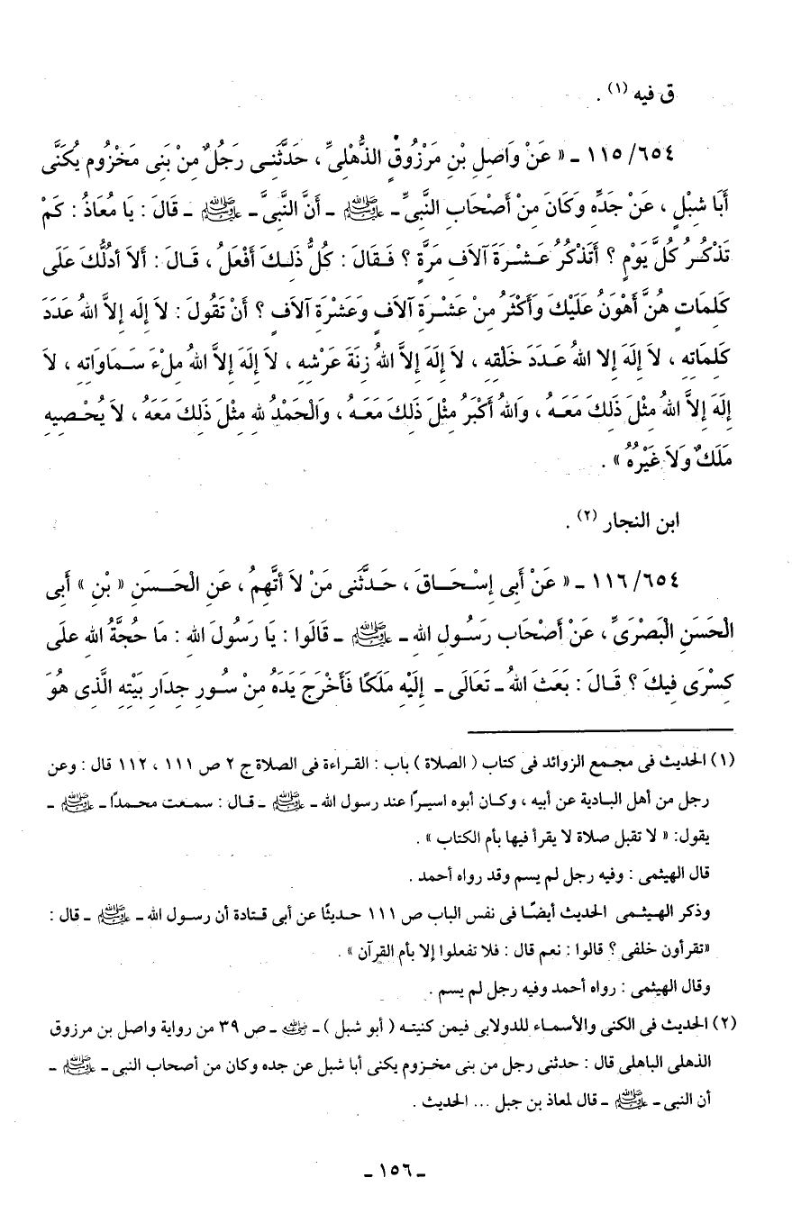 654/ 115 - "عَنْ وَاصِلِ بْنِ مَرْزُوقٍ الذُّهْلِيِّ، حَدَّثَنِي رَجُلٌ مِنْ بَنِي مَخْزُوم يُكَنَّى أَبَا شِبْلٍ، عَنْ جَدِّهِ وَكَانَ مِنْ أَصْحَابِ النَّبِيِّ - صلى الله عليه وسلم - أَنَّ النَّبِيَّ - صلى الله عليه وسلم - قَالَ: يَا مُعَاذُ: كَمْ تَذْكُرُ كُلَّ يَوْمٍ؟ أَتَذْكُرُ عَشْرَةَ آلَافِ مَرَّةٍ؟ فَقَالَ: كُلُّ ذَلِكَ أَفْعَلُ، قَالَ: أَلَا أدُلُّكَ عَلَى كَلِمَاتٍ هُنَّ أَهْوَنُ عَلَيْكَ وَأَكْثَرُ مِنْ عَشْرَةِ آلَافٍ وَعَشْرَةِ آلَافٍ؟ أَنْ تَقُولَ: لَا إِلَه إِلَّا اللهُ عَدَدَ كَلِمَاتِهِ، لَا إِلَهَ إِلا اللهُ عَدَدَ خَلْقِهِ، لَا إِلَهَ إِلَّا اللهُ زِنَةَ عَرْشِهِ، لَا إِلَهَ إِلَّا اللهُ مِلْءَ سَمَاوَاتِهِ، لَا إِلَهَ إِلَّا اللهُ مِثْلَ ذَلِكَ مَعَهُ، وَاللهُ أَكْبَرُ مِثْلَ ذَلِكَ مَعَهُ، وَالْحَمْدُ للهِ مِثْلَ ذَلِكَ مَعَهُ، لَا يُحْصِيهِ مَلَكٌ وَلاَ غَيْرُهُ".