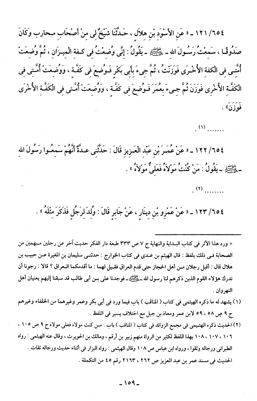 654/ 122 - "عَنْ عُمَرَ بْنِ عَبْدِ الْعَزِيزِ قَالَ: حَدَّثَنِي عدَّةٌ أَنَّهُمْ سَمِعُوا رَسُولَ اللهِ - صلى الله عليه وسلم - يَقُولُ: مَنْ كُنْتُ مَوْلَاهُ فَعَلِيٌّ مَوْلَاهُ".