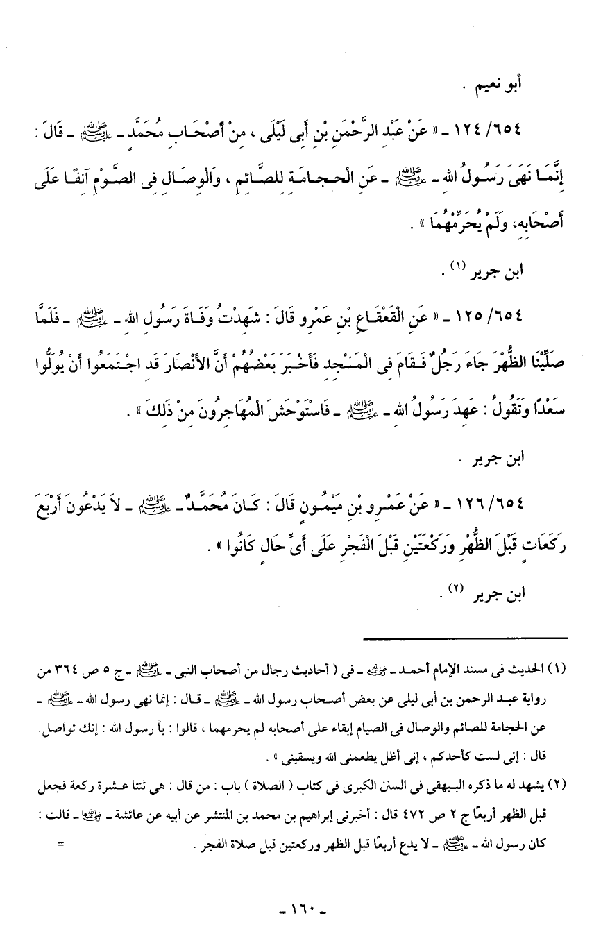 654/ 124 - "عَنْ عَبْدِ الرَّحْمَنِ بْنِ أَبِي لَيْلَى، مِنْ أَصْحَابِ مُحَمَّدٍ - صلى الله عليه وسلم - قَالَ: إِنَّمَا نَهَىَ رَسُولُ اللهِ - صلى الله عليه وسلم - عَنِ الْحجامَةِ لِلصَّائِمِ، وَالْوِصَالِ فِي الصَّوْمِ آنِفًا عَلَى أَصْحَابِهِ، وَلَمْ يُحَرِّمْهُمَا".