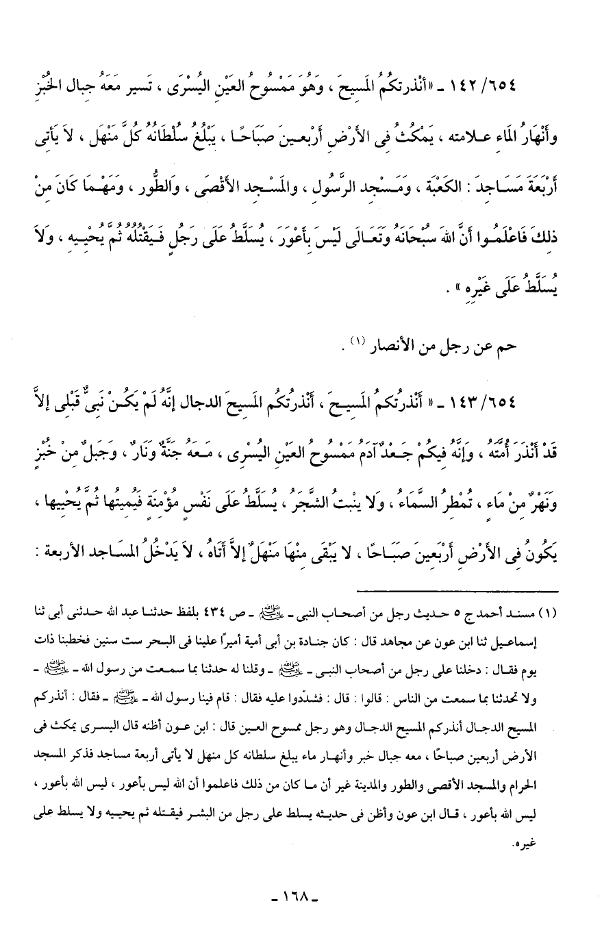 654/ 142 - "أنْذرتكُمُ المَسِيحَ، وَهُوَ مَمْسُوحُ العَيْنِ اليُسْرَى، تَسير مَعَهُ جِبال الخُبْزِ وأَنْهَارُ المَاءِ علامته، يَمْكُثُ فِي الأَرْضِ أَرْبعينَ صَبَاحًا، يَبْلُغُ سُلْطَانُهُ كُلَّ مَنْهَل، لَا يَأتِي أَرْبَعَةَ مَسَاجِدَ: الكَعْبَة، وَمَسْجِد الرَّسُولِ، والمَسْجِد الأَقْصَى، وَالطُّور، وَمَهْمَا كَانَ مِنْ ذلِكَ فَاعْلَمُوا أَنَّ اللهَ سُبْحَانَهُ وَتَعَالَى لَيْسَ بِأَعْوَرَ، يُسَلَّطُ عَلَى رَجُلٍ فَيَقْتُلُهُ ثُمَّ يُحْيِيهِ، وَلَا يُسَلَّطُ عَلَى غَيْرِهِ".