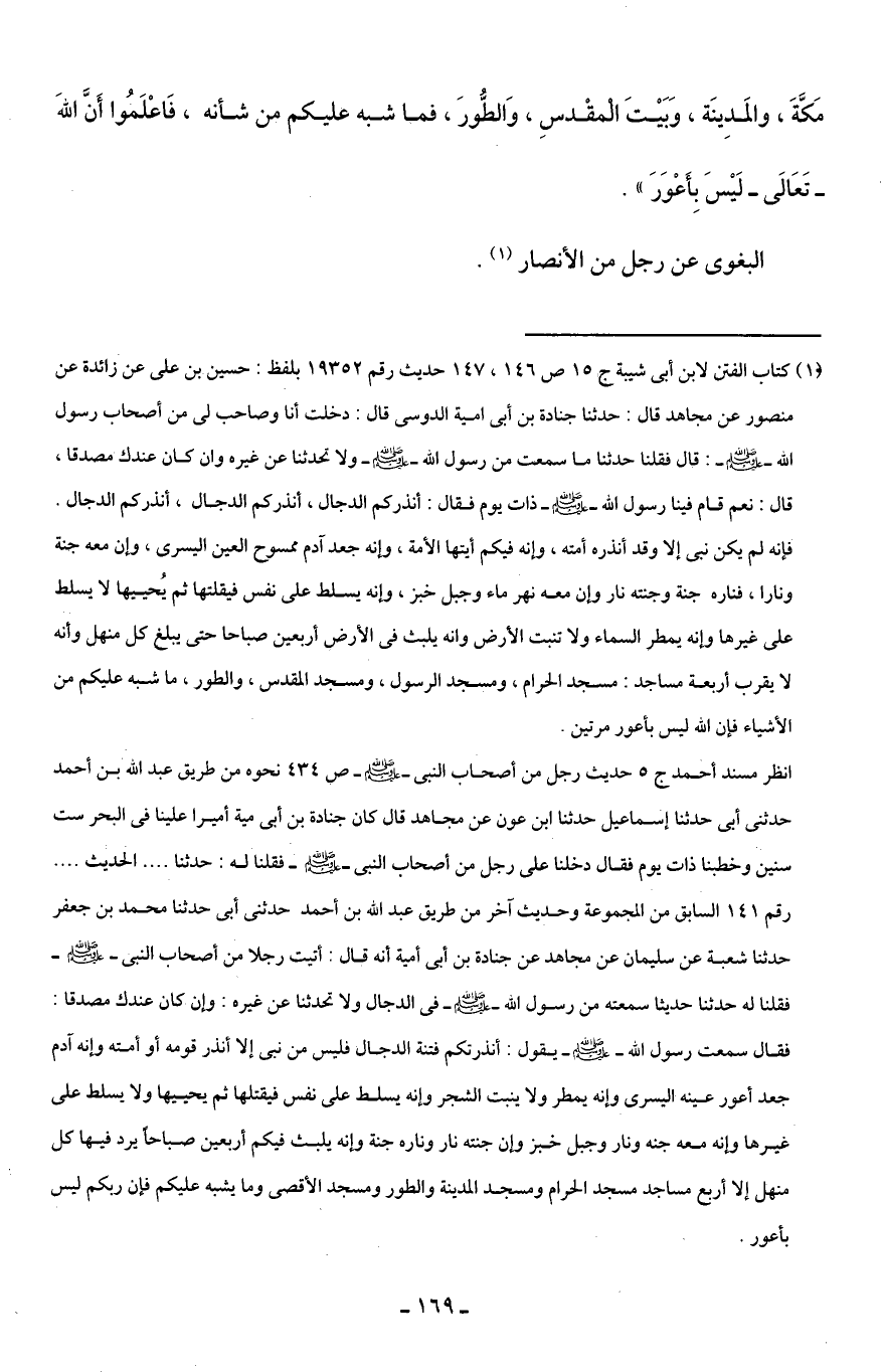 (¬1) كتاب الفتن لابن أبي شيبة ج 15 ص 146، 147 حديث رقم 19352 بلفظ: حسين بن علي عن زائدة عن منصور عن مجاهد قال: حدثنا جنادة بن أبي أمية الدوسي قال: دخلت أنا وصاحب لي من أصحاب رسول الله - صلى الله عليه وسلم -: قال فقلنا حدثنا ما سمعت من رسول الله - صلى الله عليه وسلم - ولا تحدثنا عن غيره وإن كان عندك مصدقا، قال: نعم قام فينا رسول الله - صلى الله عليه وسلم - ذات يوم فقال: أنذركم الدجال، أنذركم الدجال، أنذركم الدجال. فإنه لم يكن نبي إلا وقد أنذره أمته، وإنه فيكم أيتها الأمة، وإنه جعد آدم ممسوح العين اليسرى، وإن معه جنة ونارا، فناره جنة وجنته نار وإن معه نهر ماء وجبل خبز، وإنه يسلط على نفس فيقلتها ثم يُحييها لا يسلط على غيرها وإنه يمطر السماء ولا تنبت الأرض وإنه يلبث في الأرض أربعين صباحا حتى يبلغ كل منهل وأنه لا يقرب أربعة مساجد: مسجد الحرام، ومسجد الرسول، ومسجد المقدس، والطور، ما شبه عليكم من الأشياء فإن الله ليس بأعور مرتين.