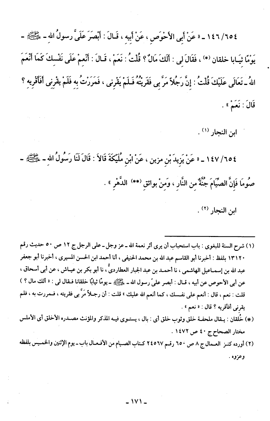 654/ 146 - "عَنْ أَبِي الأَحْوَصِ، عَنْ أبِيهِ، قَالَ: أَبْصَرَ عَلَيَّ رسولُ اللهِ - صلى الله عليه وسلم - يَوْمًا ثِيَابا خلقان (*)، فَقَالَ لِي: أَلَكَ مَالٌ؟ قُلْتُ: نَعَمْ، قَالَ: أَنْعِمْ عَلَى نَفْسِكَ كَمَا أَنْعَمَ اللهُ - تَعَالَى عَلَيْكَ قُلْتُ: إِنَّ رَجُلًا مَرَّ بِي فَقَريْتُهُ فَلَمْ يَقْرِني، فَمَرَرْتُ بِهِ فَلَمْ يقْرِنِي أَفَأَقْرِيهِ؟ قَالَ: نَعَمْ".
