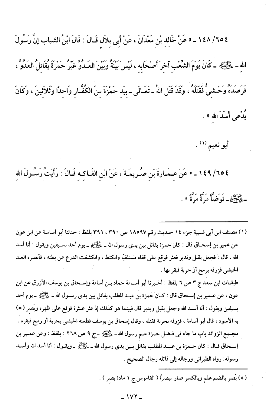 (¬1) مصنف ابن أبي شيبة جزء 14 حديث رقم 18597 ص 390، 391 بلفظ: حدثنا أبو أسامة عن ابن عون عن عمير بن إسحاق قال: كان حمزة يقاتل بين يدي رسول الله - صلى الله عليه وسلم - يوم أحد بسيفين ويقول: أنا أسد الله، قال: فجعل يقبل ويدبر فعثر فوقع على قفاه مستلقيًا وانكثط، وانكشفت الدرع عن بطنه، فأبصره العبد الحبشي فزرقه برمح أو حربة فبقر بها.