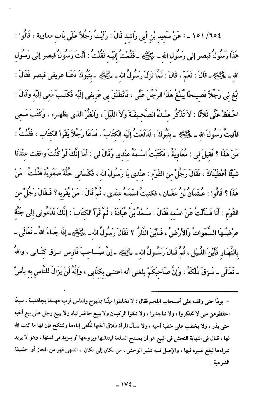 654/ 151 - "عَنْ سَعِيدِ بْنِ أَبِي رَاشِدٍ قَالَ: رَأَيْتُ رَجُلًا عَلَى بَابِ معاوية، قَالُوا: هَذَا رَسُولُ قيصر إلى رَسُولِ اللهِ - صلى الله عليه وسلم - فَقُمْتُ إِلَيْهِ فَقُلْتُ: أَنْتَ رَسُولُ قيصر إلى رَسُولِ اللهِ - صلى الله عليه وسلم - قَالَ: نَعَمْ، قَالَ: لَمَّا نَزَلَ رَسُولُ اللهِ - صلى الله عليه وسلم - بِتَبُوكَ دَعَا عريفي قيصر فَقَالَ: ابغْ لِي رَجُلًا فَصِيحًا يُبَلّغُ هَذَا الرَّجُلَ عَنِّي، فَانْطَلَقَ بِي عَرِيفى إلَيْه فَكَتَبَ مَعِي إلَيْهِ وَقَالَ: احْفَظْ عَنِّي ثَلَاثًا: لَا تَذْكُر عِنْدَهُ الصَّحِيفَةَ وَلَا اللّيْلَ، وَانْظُرْ الذي بظهره، وَكَتَبَ مَعِي فأتيتُ رَسُولَ اللهِ - صلى الله عليه وسلم - بِتَبُوكَ، فَدَفَعْتُ إلَيْهِ الْكِتَابَ، فَدَعَا رَجُلًا يَقْرأ الكِتَاب، فَقُلْتُ: مَنْ هَذَا؟ فَقِيلَ لِي: مُعَاوِيَةُ، فَكَتَبْتُ اسْمَهُ عِنْدِي وَقَالَ لي: أَمَا إنَّكَ لَوْ كُنْتَ وافقت عِنْدَنا شَيْئًا أَعْطَيْنَاكَ، فَقَالَ رَجُلٌ مِن القَوْم: عِنْدِي يَا رَسُولَ اللهِ، فَكَسَانِي حُلّةً صَفَويَّةً فَقُلْتُ: مَنْ هَذَا؟ قَالُوا: عُثْمَانُ بْنُ عَفْان، فكتبتُ اسْمَهُ عِنْدي، ثُمَ قَالَ: مَنْ يُقْرِيِه؟ فَقَالَ رَجُلٌ مِن القَوْمِ: أَنَا فَسَأَلْتُ عَنْ اسْمِهِ فَقَالَ: سَعْدُ بْنُ عُبَادَةَ، ثُمَّ قَرَأَ الكِتَابَ: إنَّكَ تَدْعُوني إِلى جَنَّةٍ عرْضُهَا السَّمَواتُ والأَرْضُ، فَأَيْنَ النَّارُ؟ فَقَالَ رَسُولُ اللهِ - صلى الله عليه وسلم - إذَا جَاءَ اللهُ - تَعَالَى- بِالنَّهَارِ فَأَيْنَ اللَّيْل، ثُمَّ قَالَ رَسُولُ اللهِ - صلى الله عليه وسلم - إنَّ صَاحِبَ فَارِس مزق كِتَابي، واللهُ - تَعَالَى- مَزقَ مُلْكَهُ، وَإنَّ صَاحِبَكُمْ بلغني أنه اعتنى بِكِتَابِي، وَإنَّهُ لَنْ يَزَالَ للنَّاسِ بِهِ بأسٌ