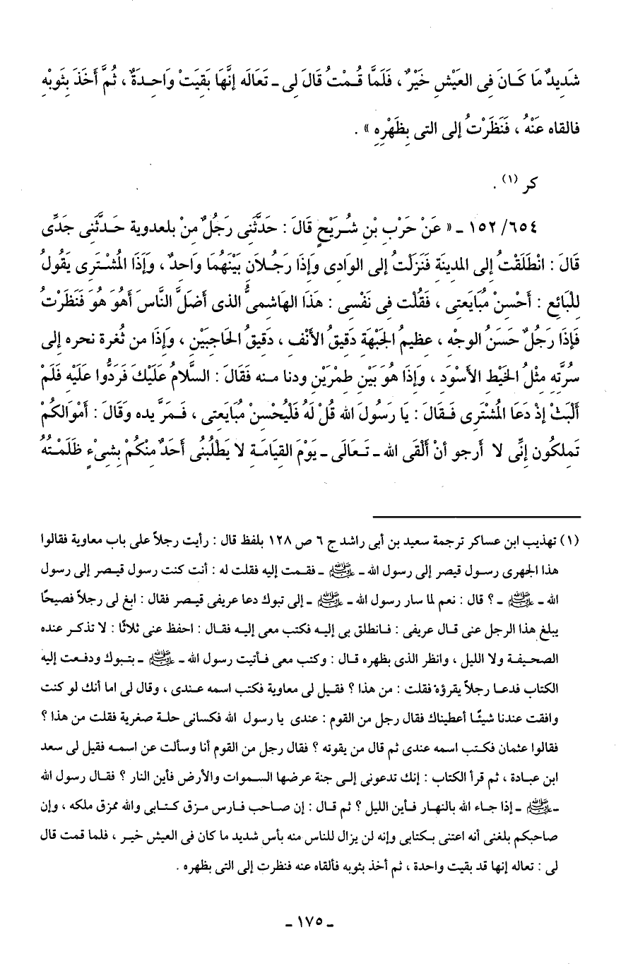 654/ 152 - "عَنْ حَرْبِ بْنِ شُرَيْحٍ قَالَ: حَدَّثَنِي رَجُلٌ مِنْ بلعدوية حَدَّثَنِي جَدِّي قَالَ: انْطَلَقْتُ إِلى المدِينَة فَنَزَلْتُ إلى الوَادِي وَإِذَا رَجُلَانِ بَيْنَهُمَا وَاحِدٌ، وَإِذَا المُشْتَرِي يَقُولُ لِلْبَائِع: أَحْسِنْ مُبَايَعتِي، فَقُلْت فِي نَفْسِي: هَذَا الهَاشِميُّ الذي أَضَلَّ النَّاسَ أَهُوَ هُوَ فَنَظَرْتُ فَإذَا رَجُلٌ حَسَنُ الوجْهِ، عَظيمُ الجَبْهَةِ دَقِيقُ الأَنْفِ، دَقِيقُ الحَاجِبَيْنِ، وَإِذَا من ثُغرة نحره إِلى سُرَّتِهِ مِثْلُ الخَيْطِ الأَسْوَدِ، وَإِذَا هُوَ بَيْنِ طِمْرَيْنِ ودنا منه فَقَالَ: السَّلامُ عَلَيْكَ فَرَدُّوا عَلَيْهِ فَلَمْ أَلْبَثْ إذْ دَعَا المُشْتَرِي فَقَالَ: يَا رَسُولَ الله قُلْ لَهُ فَلْيُحْسِنْ مُبَايَعِتي، فَمَرَّ يده وَقَالَ: أَمْوَالكُمْ تَمِلكُون إِنِّي لا أَرجو أنْ أَلْقَى الله - تَعَالَى- يَوْمَ القِيَامَةِ لا يَطْلُبُني أَحَدٌ مِنْكُمْ بِشِيْءٍ ظَلَمْتُهُ