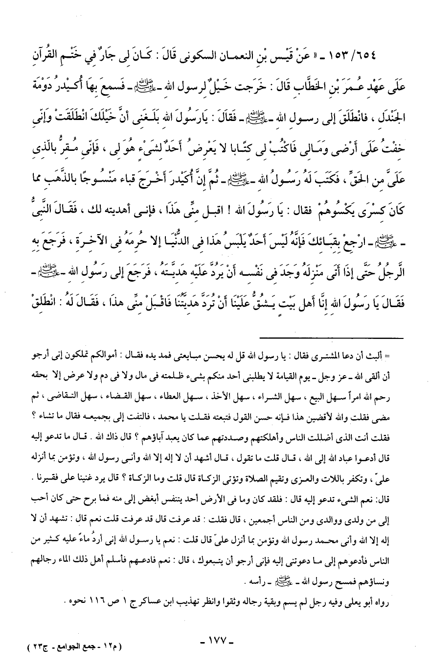 654/ 153 - "عَنْ قَيْس بْنِ النعمان السكوني قَالَ: كَانَ لِي جَارٌ فِي خَتْمِ القُرآنِ عَلَى عَهْدِ عُمَرَ بْنِ الخَطَّابِ قَالَ: خَرَجت خَيْلٌ لِرسول اللهِ - صلى الله عليه وسلم - فَسمِعَ بِهَا أُكيْدرُ دَوْمَة الجَنْدَلِ، فانْطَلَقَ إلى رسولِ اللهِ - صلى الله عليه وسلم - فَقاَلَ: يَا رَسُولَ اللهِ بَلَغَنِي أنَّ خَيْلَكَ انْطَلَقَتْ وَإنِّي خِفْتُ عَلَى أَرْضي وَمَالِي فَاكْتُبْ لِي كِتًابا لا يَعْرِضُ أَحَدٌ لِشَيْءٍ هُوَ لِي، فَإنِّي مُقِرُّ بالّذِيِ عَلَيَّ مِن الحَقِّ، فَكَتَبَ لَهُ رَسُولُ اللهِ - صلى الله عليه وسلم - ثُمَّ إِنَّ أُكَيْدرَ أَخْرَجَ قباء مَنْسُوجًا بالذَّهَبِ مما كَانَ كِسْرَى يَكْسُوهُمْ فقال: يَا رَسُولَ الله! اقبل مِنِّي هَذَا، فإني أهديته لك، فَقَالَ النَّبِيُّ - صلى الله عليه وسلم - ارْجِعْ بِقِبَائِكَ فَإنَّهُ لَيْسَ أَحَدٌ يَلْبَسُ هَذا فِي الدُّنْيَا إلا حُرِمَهُ فِي الآخِرَةِ، فَرَجَعَ بِهِ الَّرجُلُ حَتَّى إذَا أَتَى مَنْزِلَهُ وَجَدَ فِي نَفْسِه أَنْ يَرُدَّ عَلَيْهِ هَدِيَّتَهُ، فَرَجَعَ إلى رَسُولِ اللهِ - صلى الله عليه وسلم - فَقَالَ يَا رَسُولَ اللهِ إِنَّا أَهل بَيْتٍ يَشُقُّ عَلَيْنَا أَنْ تُرَدَّ هَدِيَّتُنَا فَاقْبَلْ مِنِّي هذَا، فَقَالَ لَهُ: انْطَلِقْ