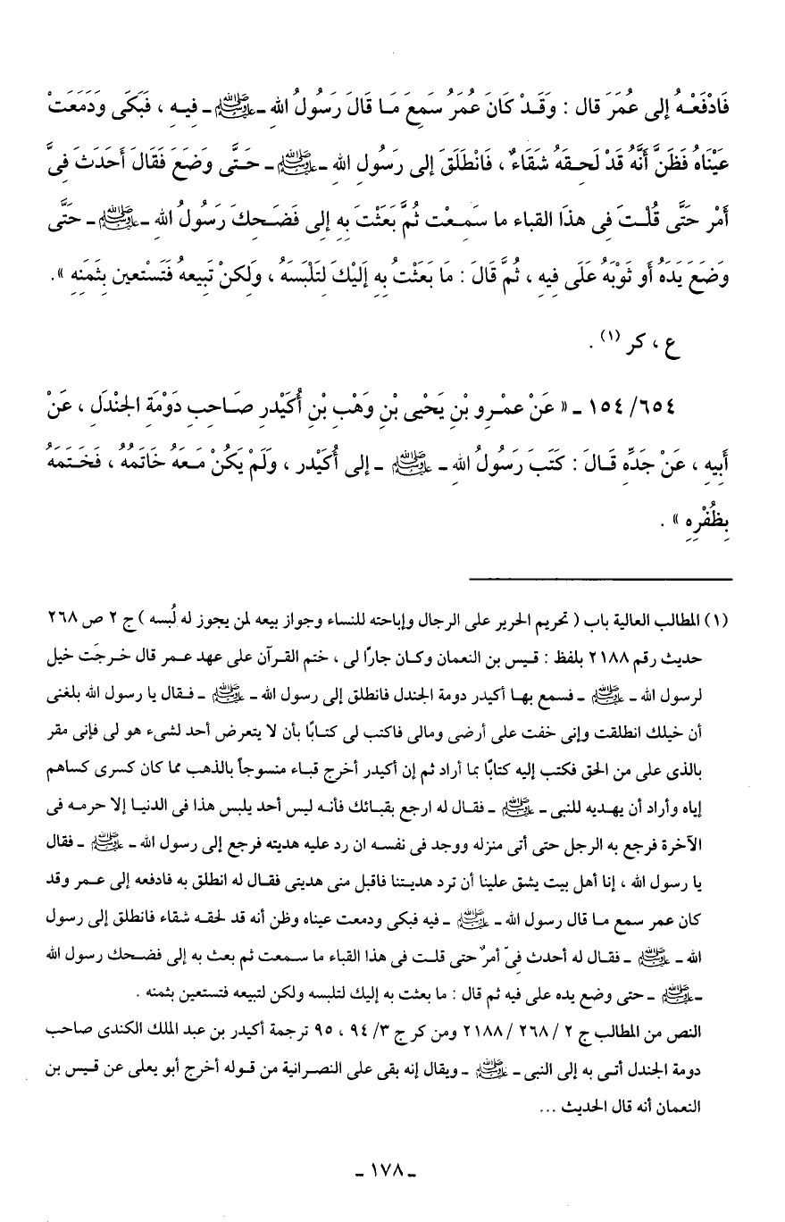 (¬1) المطالب العالية باب (تحريم الحرير على الرجال وإباحته للنساء وجواز بيعه لمن يجوز له لُبسه) ج 2 ص 268 حديث رقم 2188 بلفظ: قيس بن النعمان وكان جارًا لي، ختم القرآن على عهد عمر قال خرجَت خيل لرسول الله - صلى الله عليه وسلم - فسمع بها أكيدر دومة الجندل فانطلق إلى رسول الله - صلى الله عليه وسلم - فقال يا رسول الله بلغني أن خيلك انطلقت وإني خفت على أرضي ومالي فاكتب لي كتابًا بأن لا يتعرض أحد لشيء هو لي فإني مقر بالذي علي من الحق فكتب إليه كتابًا بما أراد ثم إن أكيدر أخرج قباء منسوجًا بالذهب مما كان كسرى كساهم إياه وأراد أن يهديه للنبي - صلى الله عليه وسلم - فقال له ارجع بقبائك فأنه ليس أحد يلبس هذا في الدنيا إلا حرمه في الآخرة فرجع به الرجل حتى أتى منزله ووجد في نفسه أن رد عليه هديته فرجع إلى رسول الله - صلى الله عليه وسلم - فقال يا رسول الله، إنا أهل بيت يشق علينا أن ترد هديتنا فاقبل مني هديتي فقال له انطلق به فادفعه إلى عمر وقد كان عمر سمع ما قال رسول الله - صلى الله عليه وسلم - فيه فبكى ودمعت عيناه وظن أنه قد لحقه شقاء فانطلق إلى رسول الله - صلى الله عليه وسلم - فقال له أحدث فِيّ أمرٌ حتى قلت في هذا القباء ما سمعت ثم بعث به إلي فضحك رسول الله - صلى الله عليه وسلم - حتى وضع يده على فيه ثم قال: ما بعثت به إليك لتلبسه ولكن لتبيعه فتستعين بثمنه.