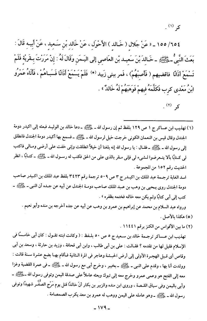 654/ 155 - "عَنْ جَلالٍ (خَالدٍ) الأَحْوَلِ، عَنْ خَالِدِ بْنِ سَعِيدٍ، عَنْ أَبِيهِ قَالَ: بَعَثَ النَّبِيُّ - صلى الله عليه وسلم - خَالِدَ بْنَ سَعِيد بْن العَاصِيِ إلى اليَمَنِ وَقَالَ لَهُ: إِنْ مَرَرْتَ بِقَريْةٍ فَلَمْ تَسْمَعْ أذَانًا فاقضيهم (فَأصِبْهُمْ)، فَمر ببنيِ زَبيد (*) فَلَمْ يَسْمَعْ أَذَانًا فَسَباهُمْ، فَأَتَاهُ عَمْرُو ابْنُ مَعْدِي كرِب فَكَلَّمَهُ فِيهمْ فَوَهَبَهُمْ لَهُ خَالدٌ".
