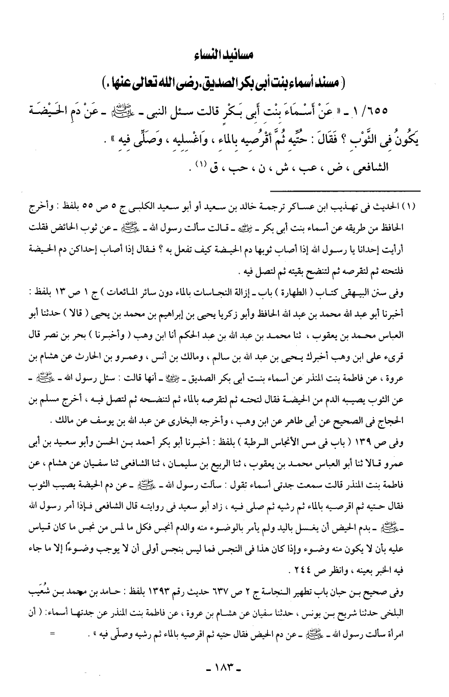 (¬1) الحديث في تهذيب ابن عساكر ترجمة خالد بن سعيد أو أبو سعيد الكلبي ج 5 ص 55 بلفظ: وأخرج الحافظ من طريقه عن أسماء بنت أبي بكر - رضي الله عنه - قالت سألت رسول الله - صلى الله عليه وسلم - عن ثوب الحائض فقلت أرأيت إحدانا يا رسول الله إذا أصاب ثوبها دم الحيضة كيف تفعل به؟ فقال إذا أصاب إحداكن دم الحيضة فلتحته ثم لتقرصه ثم لتنضح بقيته ثم لتصل فيه.