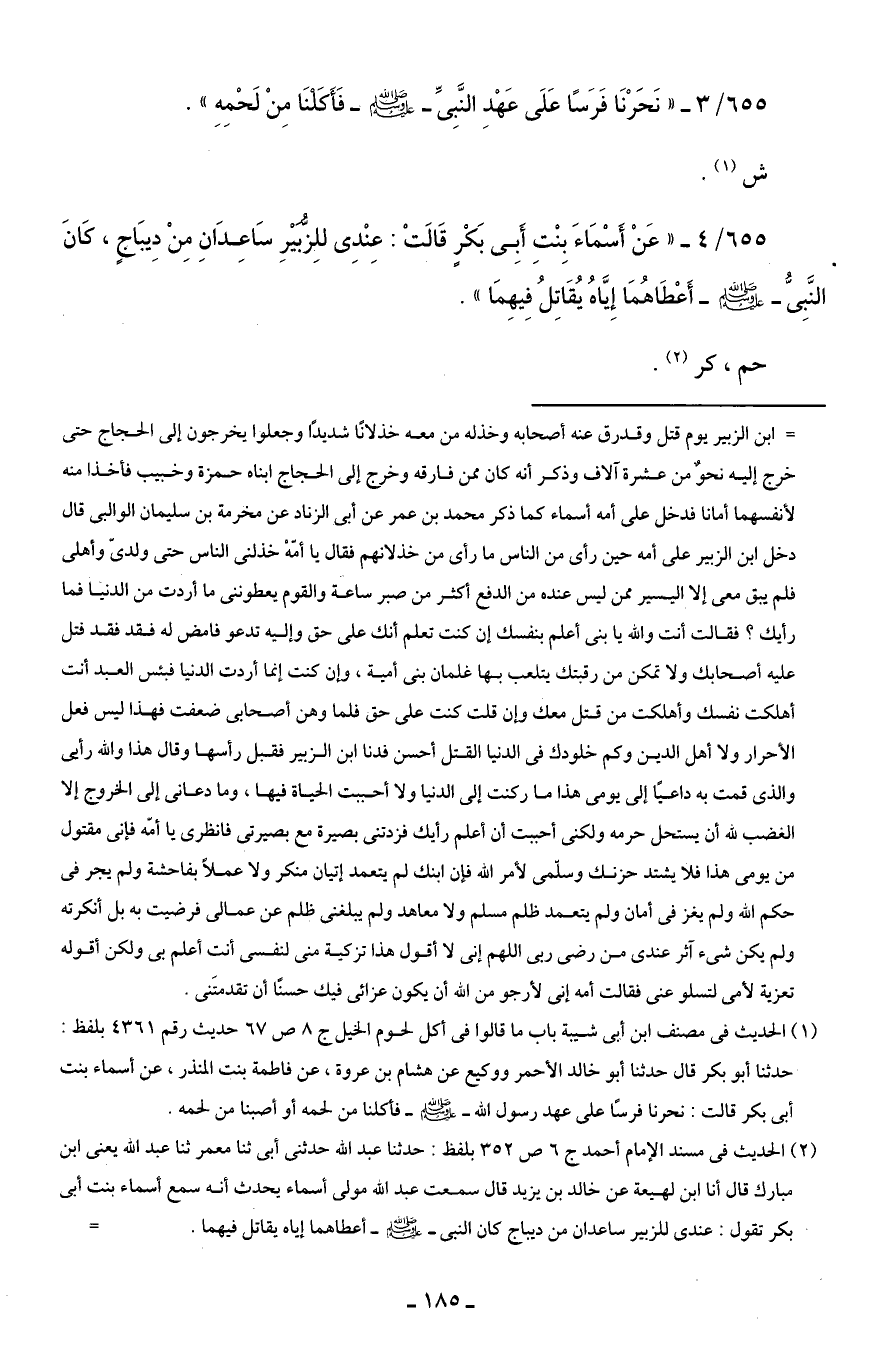 (¬2) الحديث في مسند الإمام أحمد ج 6 ص 352 بلفظ: حدثنا عبد الله حدثني أبي ثنا معمر ثنا عبد الله يعني ابن مبارك قال أنا ابن لهيعة عن خالد بن يزيد قال سمعت عبد الله مولى أسماء يحدث أنه سمع أسماء بنت أبي - بكر تقول: عندي للزبير ساعدان من ديباج كان النبي - صلى الله عليه وسلم - أعطاهما إياه يقاتل فيهما. =