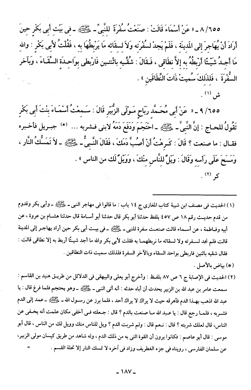 (¬1) الحديث في مصنف ابن شيبة كتاب المغازي ج 14 باب: ما قالوا في مهاجر النبي - صلى الله عليه وسلم - وأبي بكر وقدوم من قدم حديث رقم 18 ص 457 بلفظ حدثنا أبو بكر قال حدثنا أبو أسامة قال حدثنا هشام بن عروة، عن أبيه وفاطمة، عن أسماء قالت صنعت سفرة للنبي - صلى الله عليه وسلم - في بيت أبي بكر حين أراد يهاجر إلى المدينة قالت فلم نجد لسفرته ولا لسقائه ما نربطهما به فقلت لأبي بكر والله ما أجد شيئًا أربط به إلا نطاقي قالت: فقال شقيه باثنين فاربطي بواحد السقاء وبالآخر السفرة فلذلك سميت ذات النطاقين.