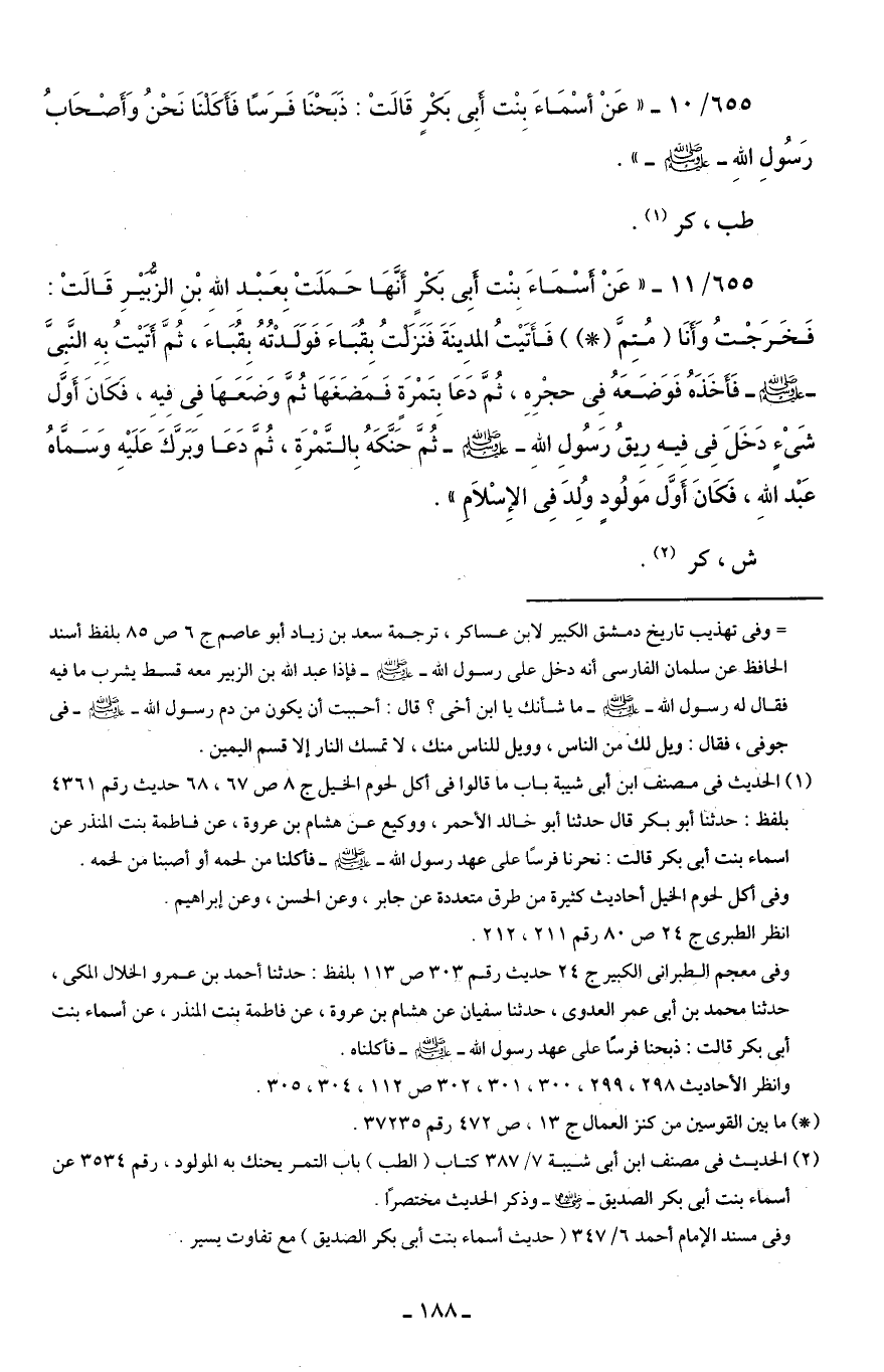 655/ 11 - "عَنْ أَسْمَاءَ بِنْت أَبِي بَكْرٍ أَنَّهَا حَمَلَتْ بِعَبْدِ اللهِ بْنِ الزُّبَيْرِ قَالَتْ: فَخَرَجْتُ وَأَنَا (مُتِمَّ (*)) فَأَتَيْتُ المدِينَةَ فَنَزَلْتُ بِقُبَاءَ فَوَلَدْتُهُ بِقُبَاءَ، ثُمَّ أَتَيْتُ بِهِ النَّبِيَّ - صلى الله عليه وسلم - فَأَخَذَهُ فَوَضَعَهُ فِي حجْرِهِ، ثُمَّ دَعَا بِتَمْرَةٍ فَمَضَغَهَا ثُمَّ وَضَعَهَا فِي فِيهِ، فَكَانَ أَوَّل شَيْءٍ دَخَلَ فِي فِيهِ رِيقُ رَسُولِ اللهِ - صلى الله عليه وسلم - ثُمَّ حَنَّكَهُ بِالتَّمْرَةِ، ثُمَّ دَعَا وَبَرَّكَ عَلَيْهِ وَسَمَّاهُ عَبْد اللهِ، فَكَانَ أَوَّل مَولُودٍ ولُدَ فِي الإِسْلَامِ".