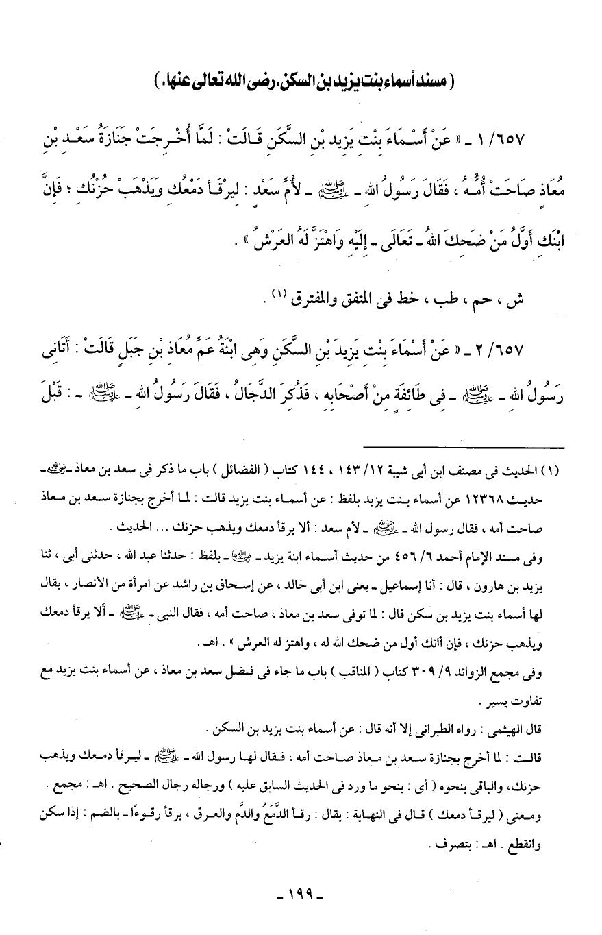 657/ 1 - " عَنْ أَسْمَاءَ بِنْتِ يَزِيد بْنِ السَّكَنِ قَالَتْ: لَمَّا أُخْرِجَتْ جَنَازَةُ سَعْدِ بْنِ مُعَاذٍ صَاحَتْ أُمُّهُ، فَقَالَ رَسُولُ اللهِ - صلى الله عليه وسلم - لأُمِّ سَعْدٍ لِيرْقَأ دَمْعُكِ وَيَذْهَبْ حُزْنُكِ؛ فَإِنَّ ابْنَكِ أَوَّلُ مَنْ ضَحِكَ اللهُ - تَعَالَى - إِلَيْهِ وَاهْتَزَّ لَهُ العَرْشُ".
