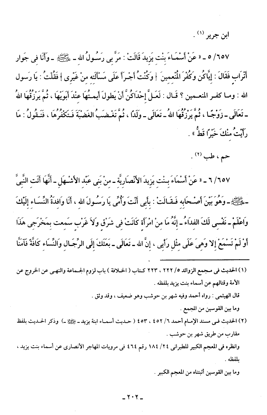 657/ 6 - "عَنْ أَسْمَاءَ بِنْتِ يَزِيدَ الأَنْصَارِيَّةِ - مِنْ بَنِي عَبْدِ الأَشْهَلِ- أَنَّهَا أَتَتِ النَّبِيَّ - صلى الله عليه وسلم - وَهُوَ بَيْنَ أَصْحَابِهِ فَقَالَتْ: بِأَبِي أَنْتَ وَأُمِّي يَا رَسُولَ اللهِ، أَنَا وَافِدَةُ النِّسَاءِ إِلَيْكَ وَاعْلَمْ - نَفْسِي لَكَ الفِدَاءُ - إِنَّهُ مَا مِنْ امْرَأَةٍ كَانَتْ في شَرْقٍ وَلاَ غَرْبٍ سَمِعت بِمَخْرَجِي هَذَا أَوْ لَمْ تَسْمَعْ إِلا وَهِيَ عَلَى مِثْلِ رَأْيِى، إِنَّ الله - تَعَالَى- بَعَثَكَ إِلَى الرِّجَالِ وَالنِّسَاءِ كَافَّةً فَآمَنَّا