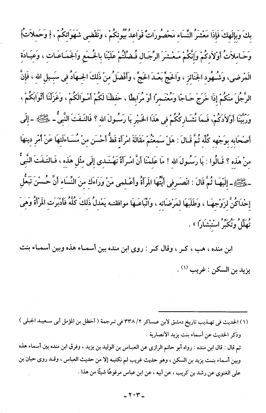 بِكَ وَبِإِلَهِكَ فَإِذَا مَعْشَرُ النِّسَاءِ مَحْصُورَاتٌ قَوَاعِدُ بُيُوتِكُمْ، وَتَقْضِي شَهَوَاتِكُمْ، [وَحَمِلَاتُ] وَحَامِلَاتُ أَوْلَادِكُمْ وَإِنَّكُمْ مَعْشَرَ الرِّجَالِ فُضِّلْتُمْ عَلَيْنَا بِالجُمَعِ وَالجَمَاعَاتِ، وَعِيَادَةِ الَمْرضى، وَشُهُودِ الجَنَائِزِ، وَالحَجِّ بَعْدَ الحَجِّ، وَأَفْضَلُ مِنْ ذَلِكَ الجِهَادُ في سَبِيلِ اللهِ، فَإِنَّ الرَّجُلَ منْكُمْ إِذَا خَرَجَ حَاجّا وَمُعْتَمِرًا أَوْ مُرَابِطًا، حَفِظْنَا لَكُمْ أَمْوَالَكُمْ، وَغَزَلْنَا أَثْوَابَكُمْ، وَرَبَّيْنَا أَوْلَادَكُمْ، فَمَا نُشَارِكُكُمْ في هَذَا الخَيْرِ يَا رَسُولَ اللهِ؟ فَالتَفَتَ النَّبِيُّ - صلى الله عليه وسلم - إِلَى أَصْحَابِهِ بِوَجْهِهِ كُلِّهِ ثُمَّ قَالَ: هَلْ سَمِعْتُمْ مَقَالَةَ امْرَأَةٍ قَطُّ أَحْسَن مِنْ مُسَاءَلَتِهَا عَنْ أَمْرِ دِينهَا مِنْ هَذِهِ؟ قَالُوا: يَا رَسُولَ اللهِ! مَا عَلِمْنَا أَنَّ امْرَأَةً تَهْتَدِي إِلَى مِثْلِ هَذِهِ، فَالتَفَتَ النَّبِيُّ - صلى الله عليه وسلم - إِلَيْهَا ثُمَّ قَالَ: انْصَرِفِي أَيَّتُهَا المَرَأَةُ وأَعْلِمي مَنْ وَرَاءَكِ مِنَ النِّسَاءِ أَنَّ حُسْنَ تَبَعُّلِ إِحْدَاكُنَّ لِزَوْجِهَا، وَطَلَبَهَا لِمَرْضَاتِهِ، وَاتِّبَاعَهَا موافقته يَعْدِلُ ذَلِكَ كُلَّهُ فَأَدْبَرَتِ المَرْأَةُ وَهِيَ تُهَلِّلُ وَتُكَبِّرُ اسْتِبْشَارًا".