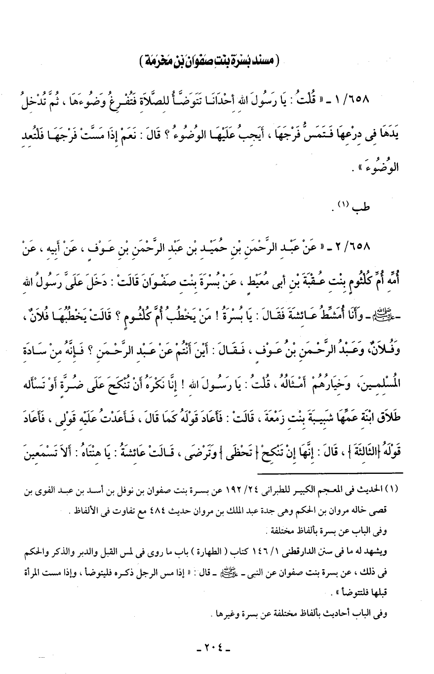 658/ 2 - "عَنْ عَبْدِ الرَّحْمَنِ بْنِ حُمَيْدِ بْن عَبْدِ الرَّحْمَنِ بْنِ عَوْفٍ، عَنْ أَبِيهِ، عَنْ أُمِّهِ أُمِّ كُلْثُومٍ بِنْتِ عُقْبَةَ بْنِ أبي مُعَيْطٍ، عَنْ بُسْرَةَ بِنْتِ صَفْوَانَ قَالَتْ: دَخَلَ عَلَيَّ رَسُولُ اللهِ - صلى الله عليه وسلم - وَأَنَا أُمَشِّطُ عَائِشَةَ فَقَالَ: يَا بُسْرَةُ! مَنْ يَخْطُبُ أُمَّ كُلْثُومٍ؟ قَالَتْ يَخْطُبُهَا فُلَانٌ، وَفُلَانٌ، وَعَبْدُ الرَّحْمَنِ بْنُ عَوْفٍ، فَقَالَ: أَيْنَ أَنْتُمْ عَنْ عَبْدِ الرَّحْمَنِ؟ فَإِنَّهُ مِنْ سَادَةِ المُسْلِمِينَ، وَخِيَارُهُمْ أَمْثَالُهُ، قُلْتُ: يَا رَسُولَ اللهِ! إِنَّا نَكْرَهُ أَنْ تُنْكَحَ عَلَى ضُرَّةٍ أَوْ تَسْأَله طَلَاق ابْنَةِ عَمِّهَا شَبِيبَةَ بِنْتِ زَمْعَةَ، قَالَتْ: فَأَعَادَ قَوْلَهُ كمَا قَالَ، فَأَعَدْتُ عَلَيْهِ قَوْلِي، فَأَعَادَ قَوْلَهُ [الثَالِثَةَ]، قَالَ: إِنَّهَا إِنْ تَنْكِحْ [تَحْظَى] وَتَرْضَى، قَالَتْ عَائِشَةُ: يَا هِنْتَاهُ: أَلَا تَسْمَعِينَ