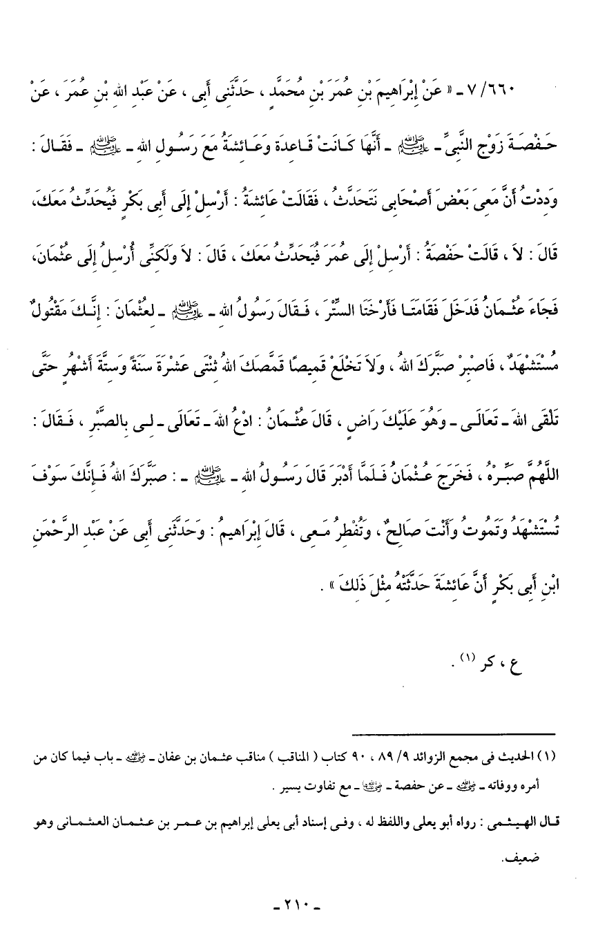 660/ 7 - "عَنْ إِبْرَاهِيمَ بْنِ عُمَرَ بْنِ مُحَمَّدٍ، حَدَّثَنِي أَبِي، عَنْ عَبْدِ اللهِ بْنِ عُمَرَ، عَنْ حَفْصَةَ زَوْج النَّبِيِّ - صلى الله عليه وسلم - أَنَّهَا كَانَتْ قَاعِدَة وَعَائِشَةُ مَعَ رَسُولِ اللهِ - صلى الله عليه وسلم - فَقَالَ: وَدِدْتُ أَنَّ مَعِيَ بَعْضَ أَصْحَابِي نَتَحَدَّثُ، فَقَالَتْ عَائِشَةُ: أَرْسِلْ إِلَى أَبِي بَكْرٍ فَيُحَدِّثُ مَعَكَ، قَالَ: لَا، قَالَتْ حَفْصَةُ: أَرْسِلْ إِلَى عُمَرَ فُيَحَدِّثُ مَعَكَ، قَالَ: لَا وَلَكِنِّي أُرْسِلُ إِلَى عُثْمَانَ، فَجَاءَ عُثْمَانُ فَدَخَلَ فَقَامَتَا فَأَرْخَتَا السِّتْرَ، فَقَالَ رَسُولُ اللهِ - صلى الله عليه وسلم - لِعُثْمَانَ: إِنَّكَ مَقْتُولٌ مُسْتَشْهَدٌ، فَاصْبِرْ صَبَّرَكَ اللهُ، وَلَا تَخْلَعْ قَمِيصًا قَمَّصَكَ اللهُ ثِنْتَي عَشْرَةَ سَنَةً وَسِتَّةَ أَشْهُرٍ حَتَّى تَلْقَى اللهَ - تَعَالَى - وَهُوَ عَلَيْكَ رَاضٍ، قَالَ عُثْمَانُ: ادْعُ اللهَ - تَعَالَى - لِي بِالصَّبْرِ، فَقَالَ: اللَّهُمَّ صَبِّرْهُ، فَخَرَجَ عُثْمَانُ فَلَمَّا أَدْبَرَ قَالَ رَسُولُ اللهِ - صلى الله عليه وسلم -: صَبَّرَكَ اللهُ فَإِنَّكَ سَوْفَ تُسْتَشْهَدُ وَتَمُوتُ وَأَنْتَ صَالِحٌ، وَتُفْطِرُ مَعِي، قَالَ إِبْرَاهيمُ: وَحَدَّثَنِي أَبِي عَنْ عَبْدِ الرَّحْمَنِ ابْنِ أَبِي بَكْرٍ أَنَّ عَائِشَةَ حَدَّثَتْهُ مِثْلَ ذَلِكَ".
