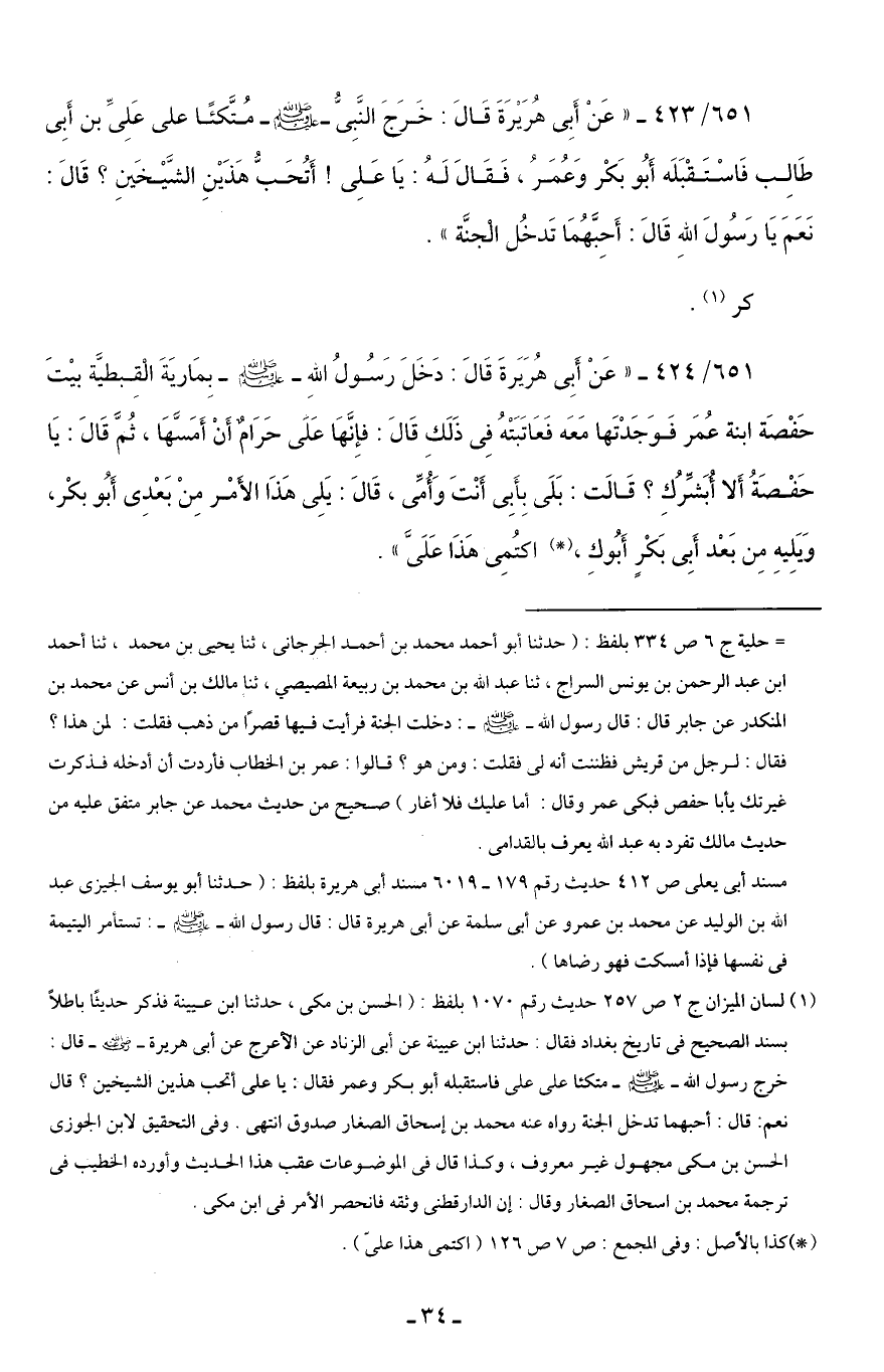 651/ 423 - "عَنْ أَبِي هُرَيْرَةَ قَالَ: خَرَجَ النَّبِيُّ - صلى الله عليه وسلم - مُتَّكئًا على عَلِيِّ بن أَبِي طَالِب فَاسْتقْبَلَه أَبُو بَكْر وَعُمَرُ، فَقَالَ لَهُ: يَا عَلِي! أَتُحَبُّ هَذَيْنِ الشَّيْخَينِ؟ قَالَ: نَعَمَ يَا رَسُولَ اللهِ قَالَ: أَحِبَّهُمَا تَدخُل الْجنَّة".